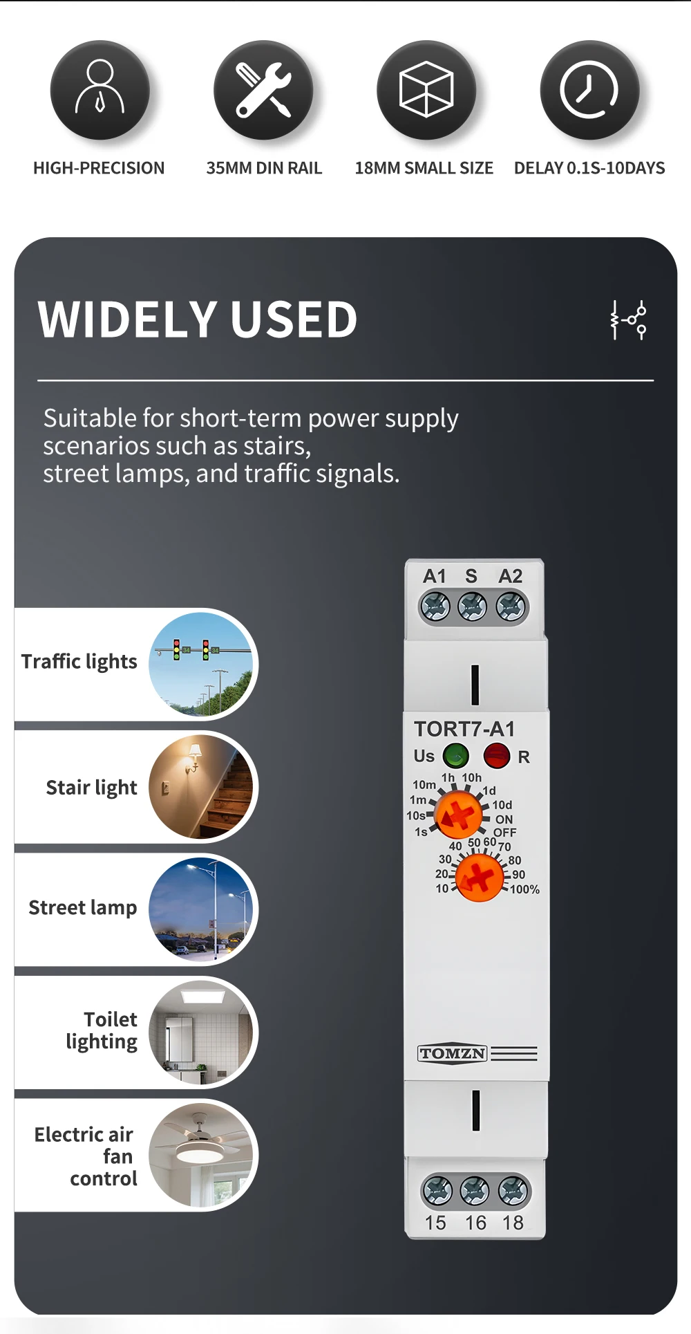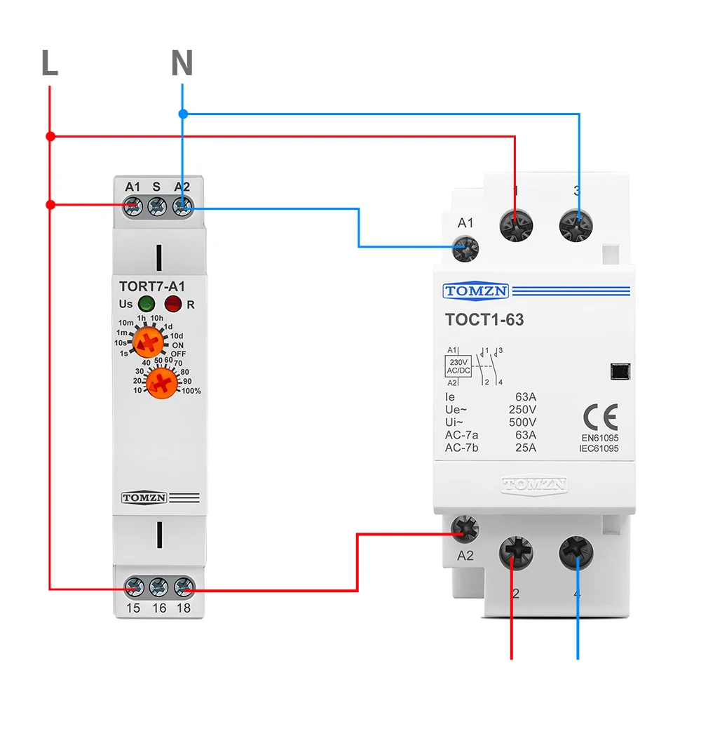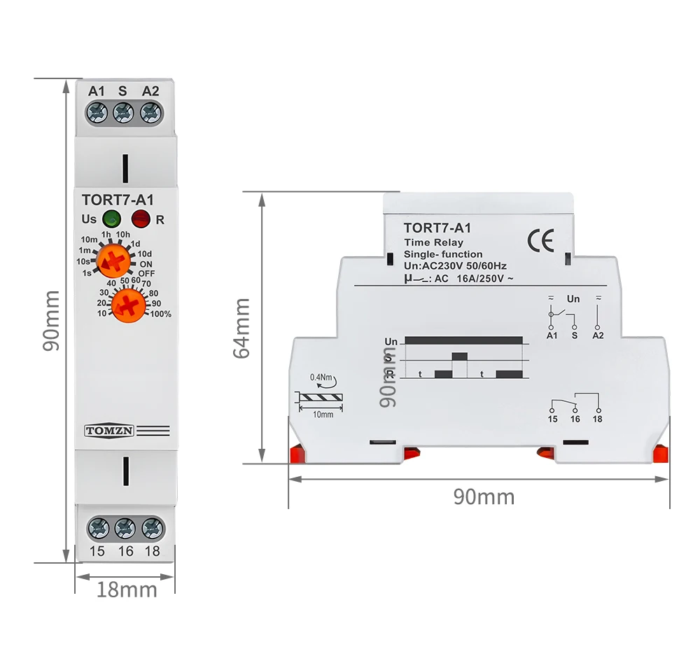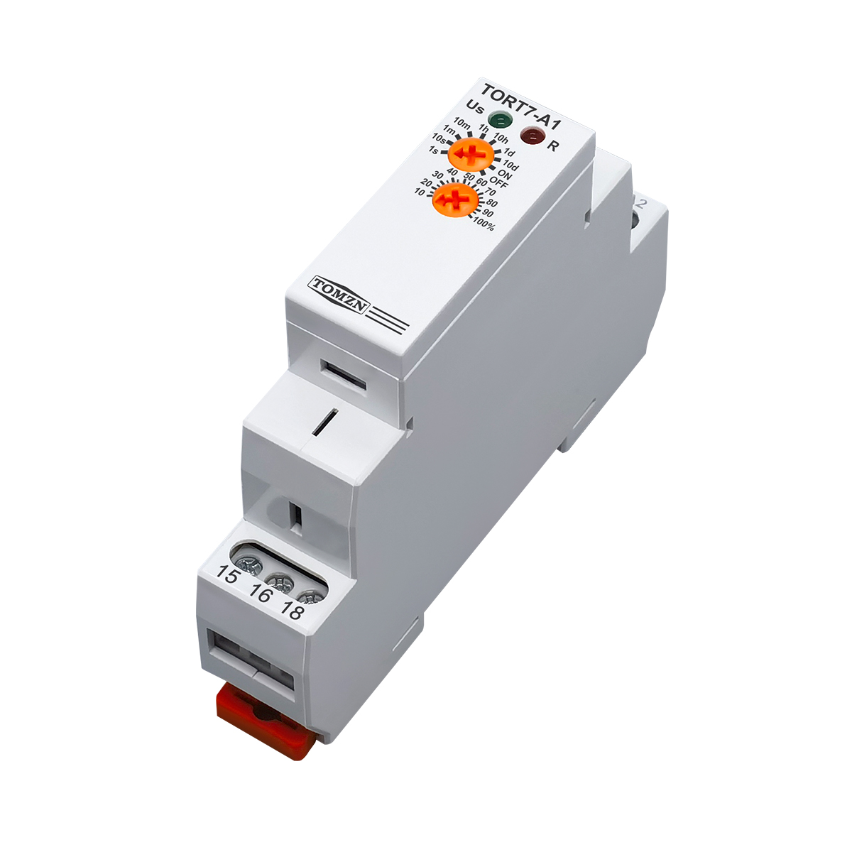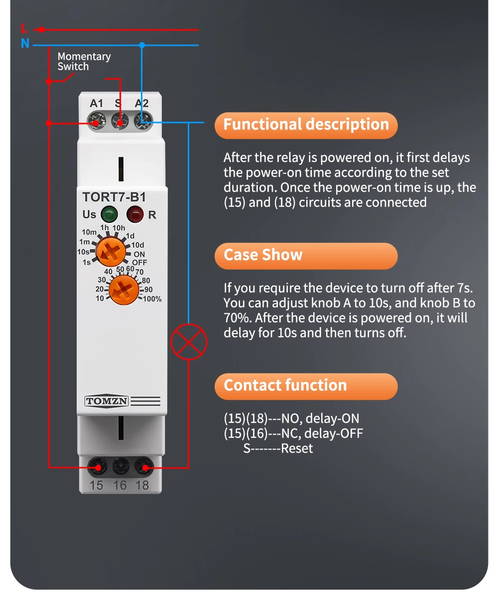 TOMZN TORT7-A1/B1 is a versatile, high-performance off-delay time relay designed for robust industrial automation and control applications. It excels in scenarios requiring a delayed ON/OFF after a control signal is removed, such as providing pump decay time after a heating system is switched off or for the extended operation of ventilation fans. With a flexible timing capacity that scales from 0.1 seconds up to 10 days across ten selectable ranges, it offers unparalleled adjustment versatility. The relay is available in two output configurations to suit various load control needs and features a clear LED status indicator for easy monitoring. Housed in a standard 18mm DIN rail module.