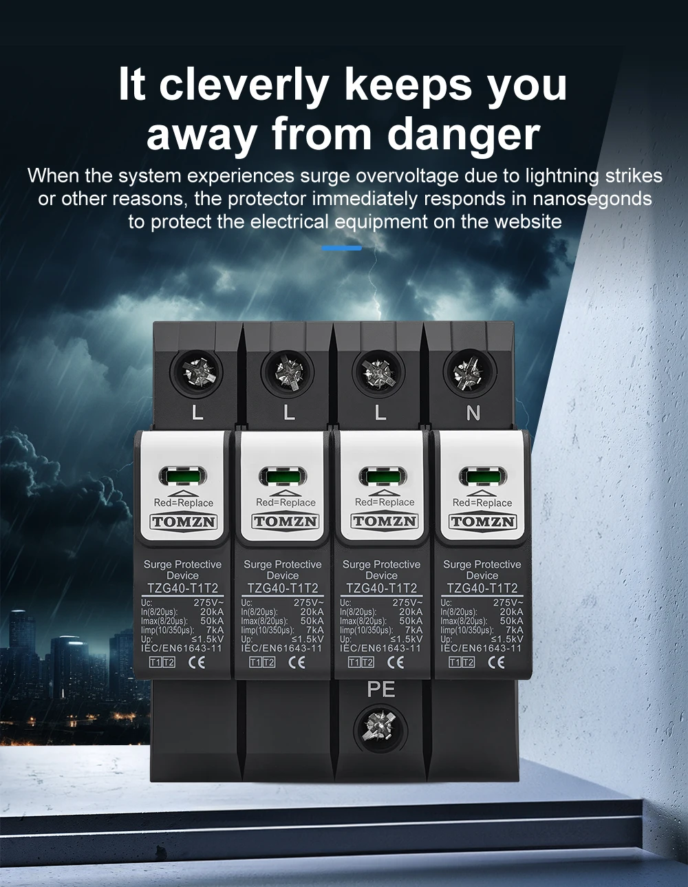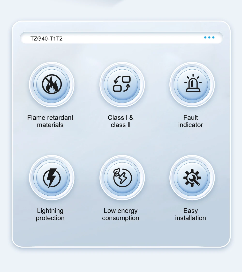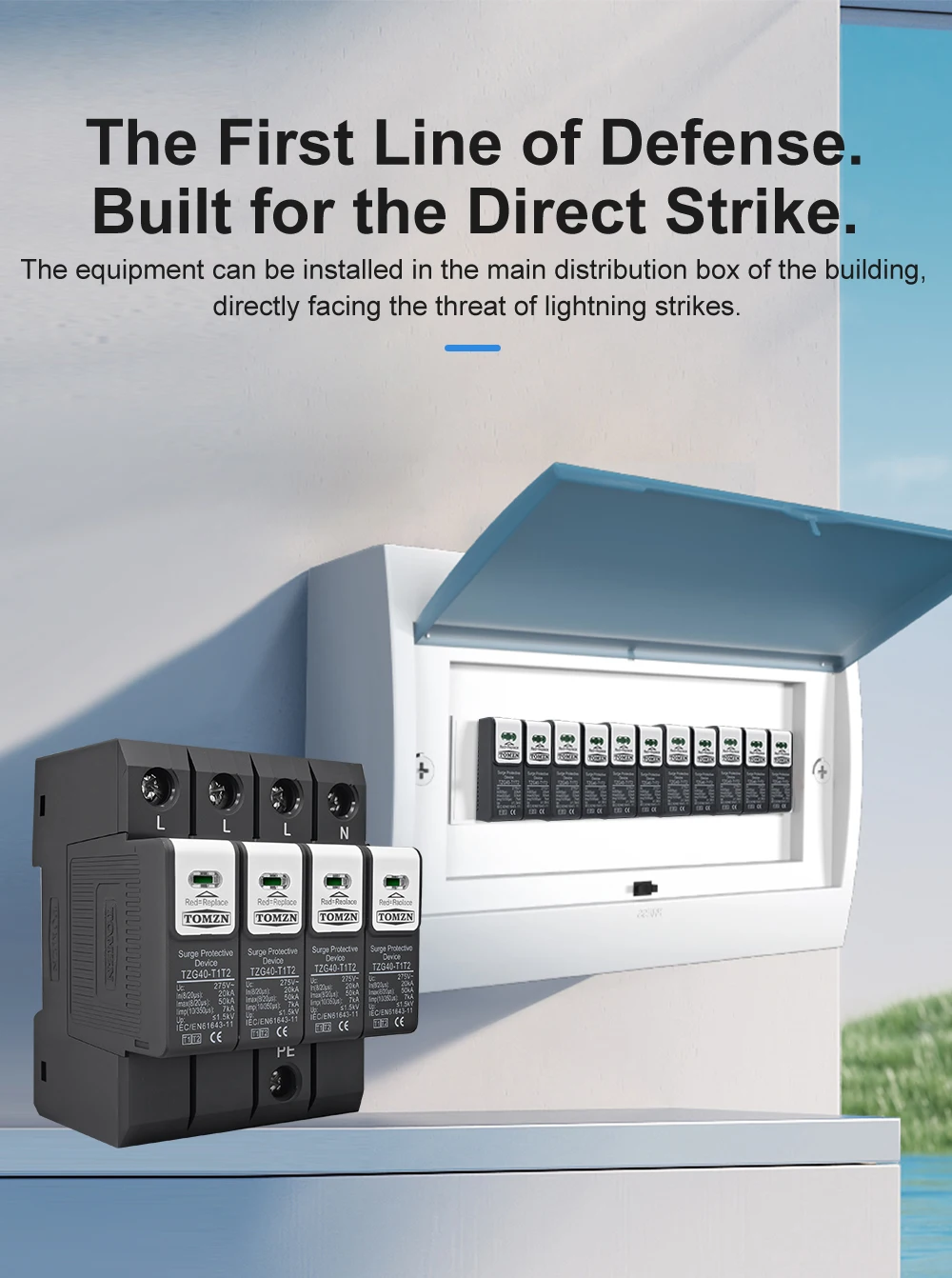 TZG40-T1T2 offers comprehensive protection by integrating both Type 1 (T1) and Type 2 (T2) capabilities into one unit. It is designed for installation at the main distribution board, where it can safely dissipate high-energy direct lightning currents (Iimp) and suppress common surge voltages, providing a seamless defense across multiple threat levels.