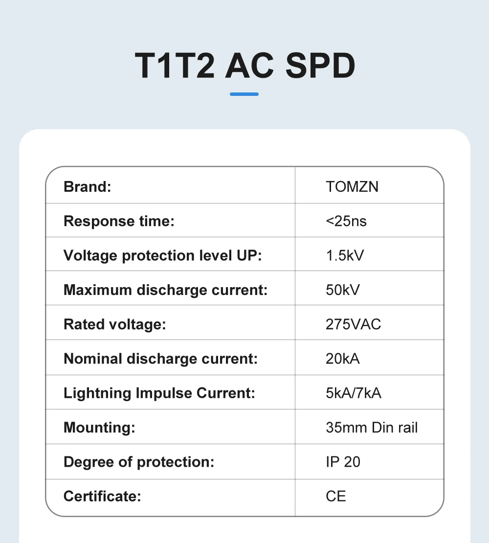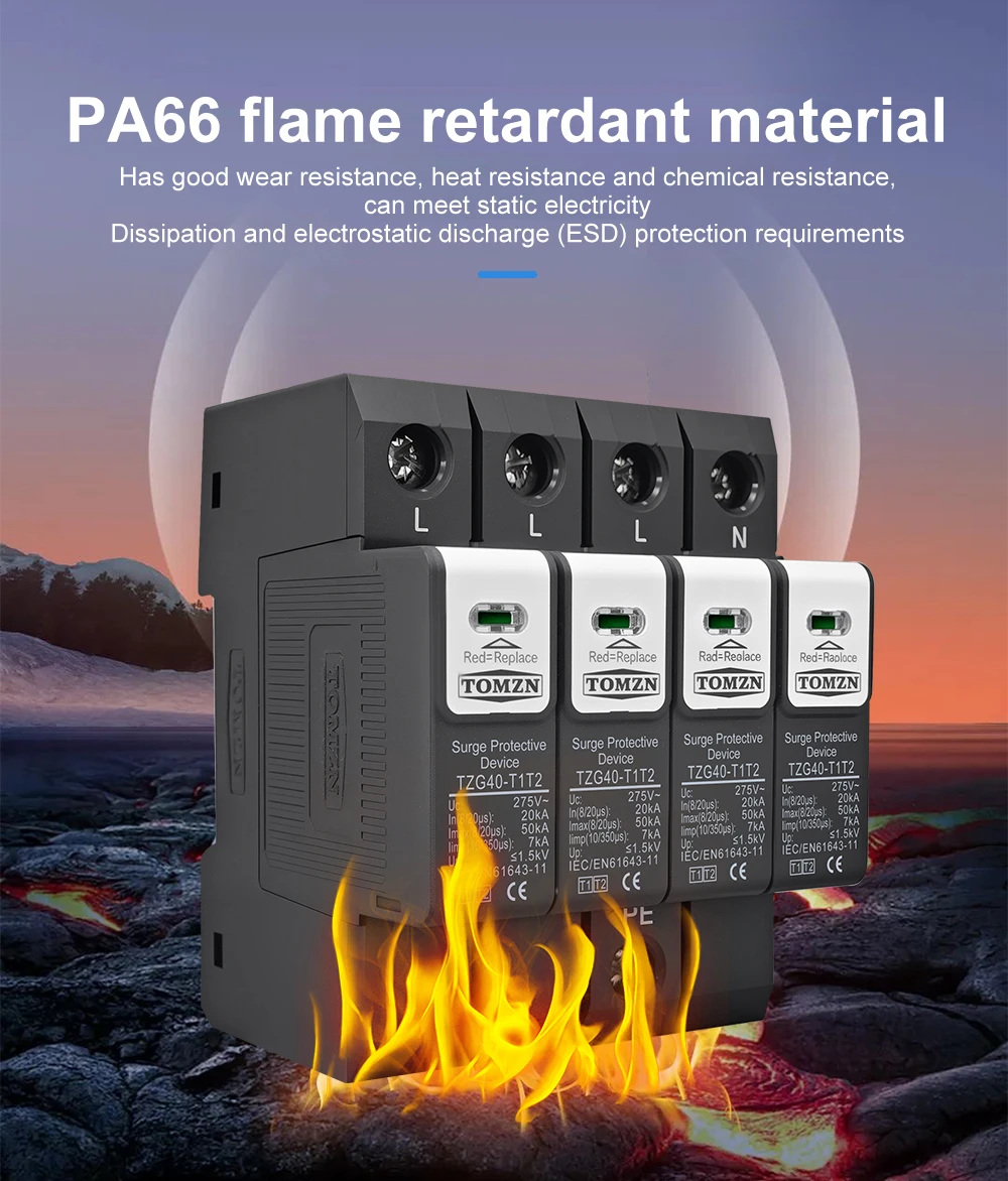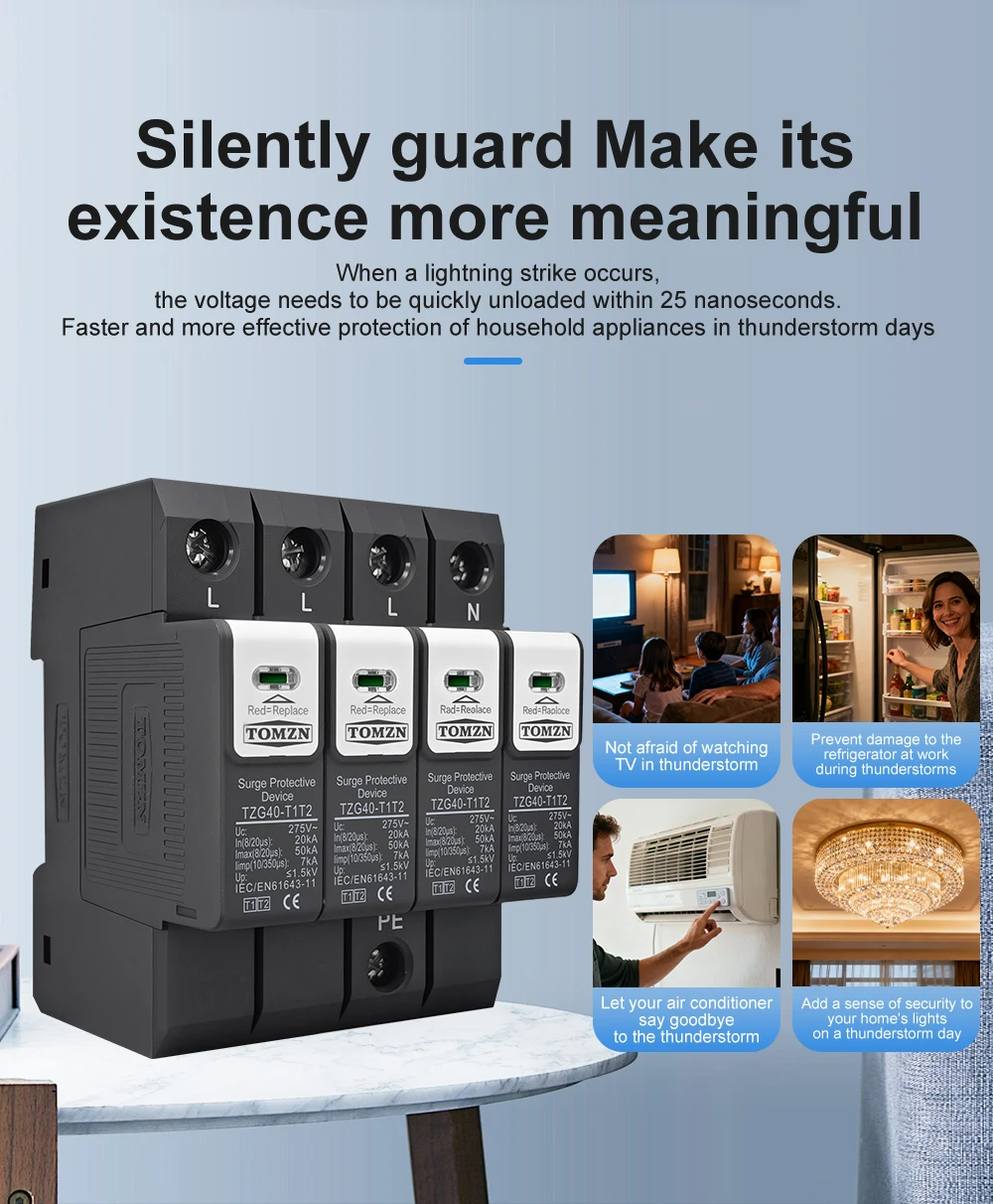 TZG40-T1T2 offers comprehensive protection by integrating both Type 1 (T1) and Type 2 (T2) capabilities into one unit. It is designed for installation at the main distribution board, where it can safely dissipate high-energy direct lightning currents (Iimp) and suppress common surge voltages, providing a seamless defense across multiple threat levels.