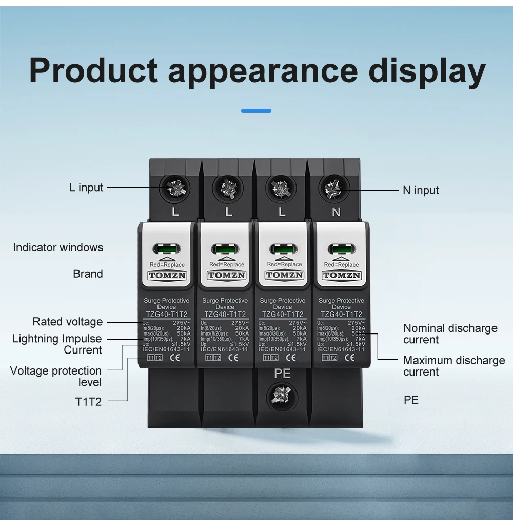 Understanding that every installation is unique, the TZG40-T1T2 is customizable to meet your specific needs. Whether you require a different voltage or currents, or even RS485 functions, our customer service is ready to assist you with tailoring the device to your specific requirements. Its standard IEC/EN61643-11 compliance ensures compatibility with a broad range of electrical systems, making it a versatile and adaptable choice for various environments.