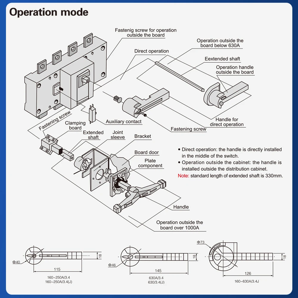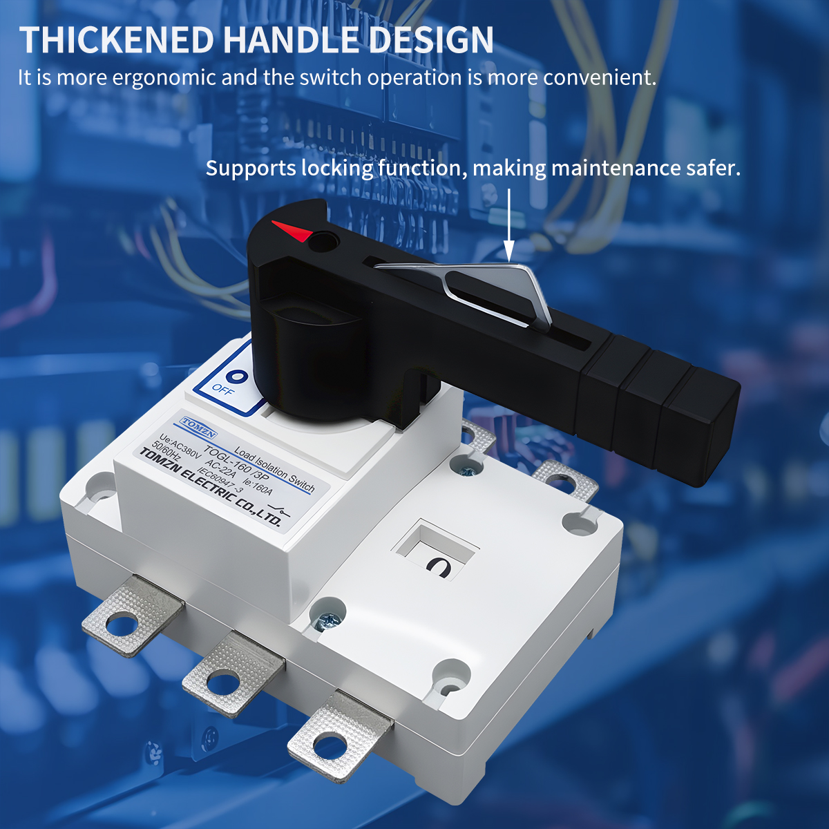This 3P (three-phase) disconnector switch operates at AC 380V with a current rating of 160A, making it suitable for a wide range of electrical systems. It is compatible with both 50Hz and 60Hz frequencies, ensuring flexibility in different power supply environments. The switch is equipped with thickened contacts, which enhance conductivity and reduce resistance, leading to improved performance and longer service life. This feature is especially important in high-current applications where reliability is essential.