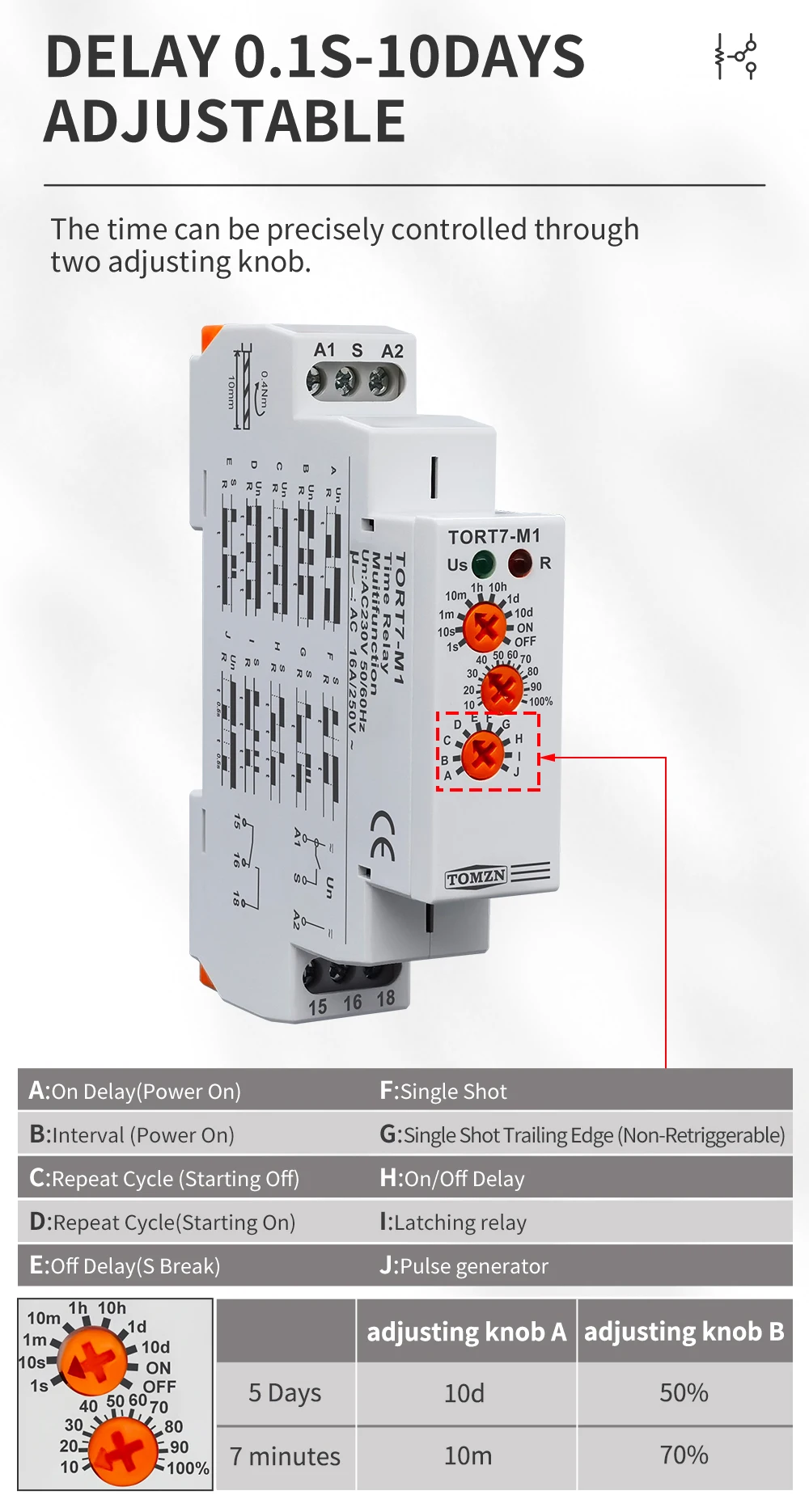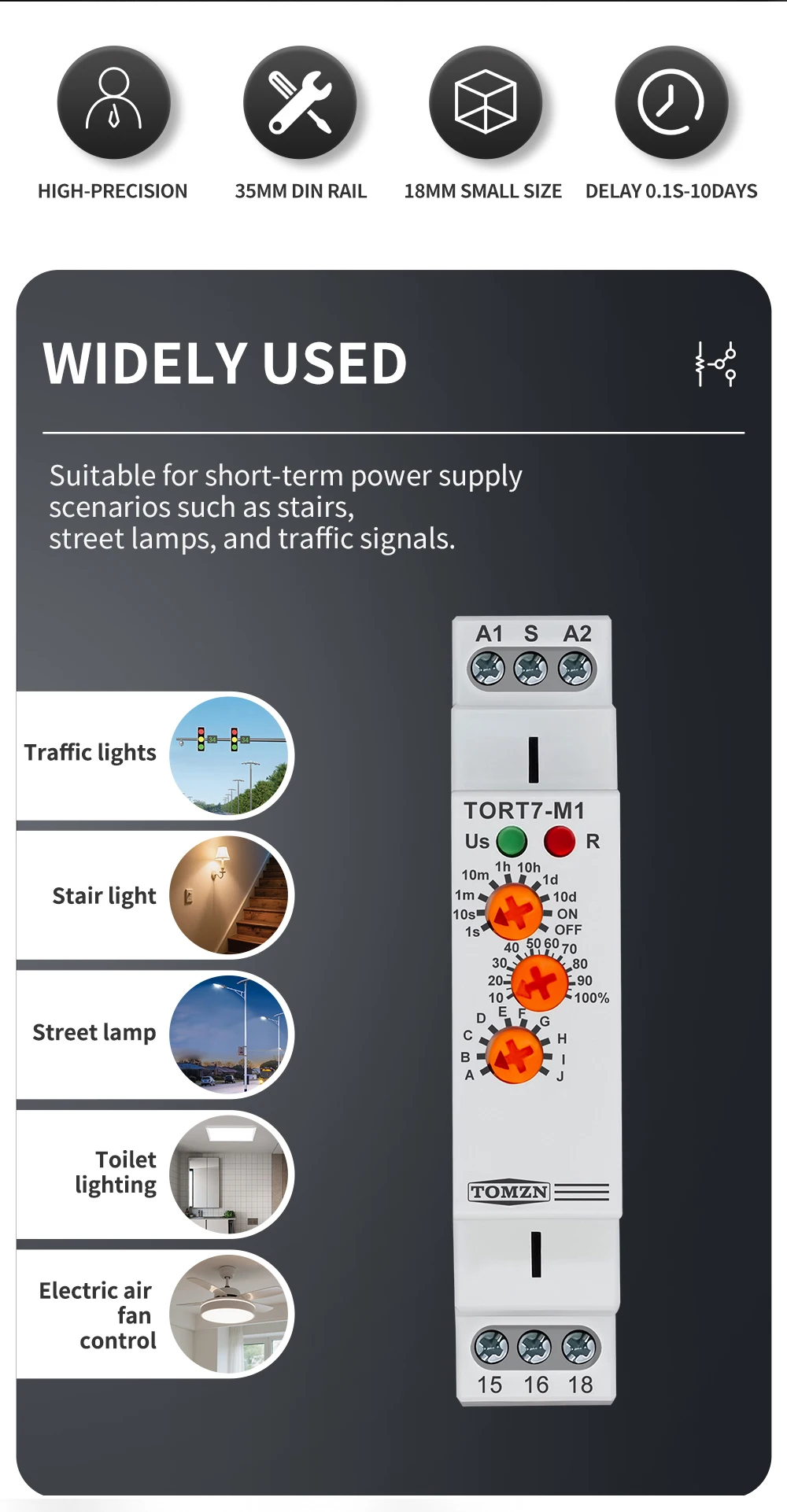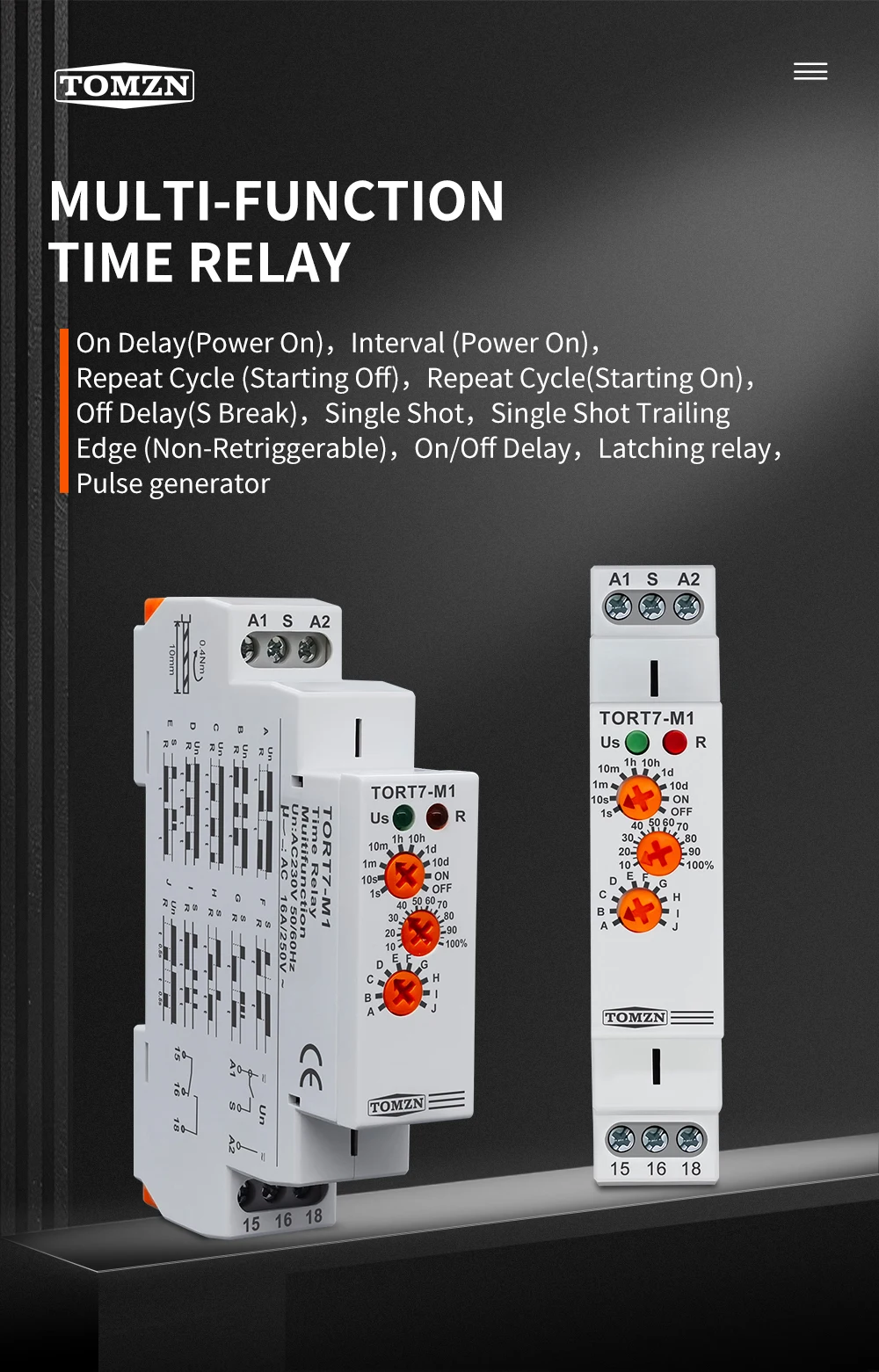 TORT7-M1 is a versatile solution for controlling electrical appliances, lighting, heating, motors, pumps, and fans. It offers 10 timing functions and 10 adjustable time ranges, from 0.1 seconds to 10 days, all easily set via user-friendly rotary switches. Supporting multi-voltage applications, this compact DIN rail module provides reliable automation with a clear LED status indicator for seamless integration into various control systems.
