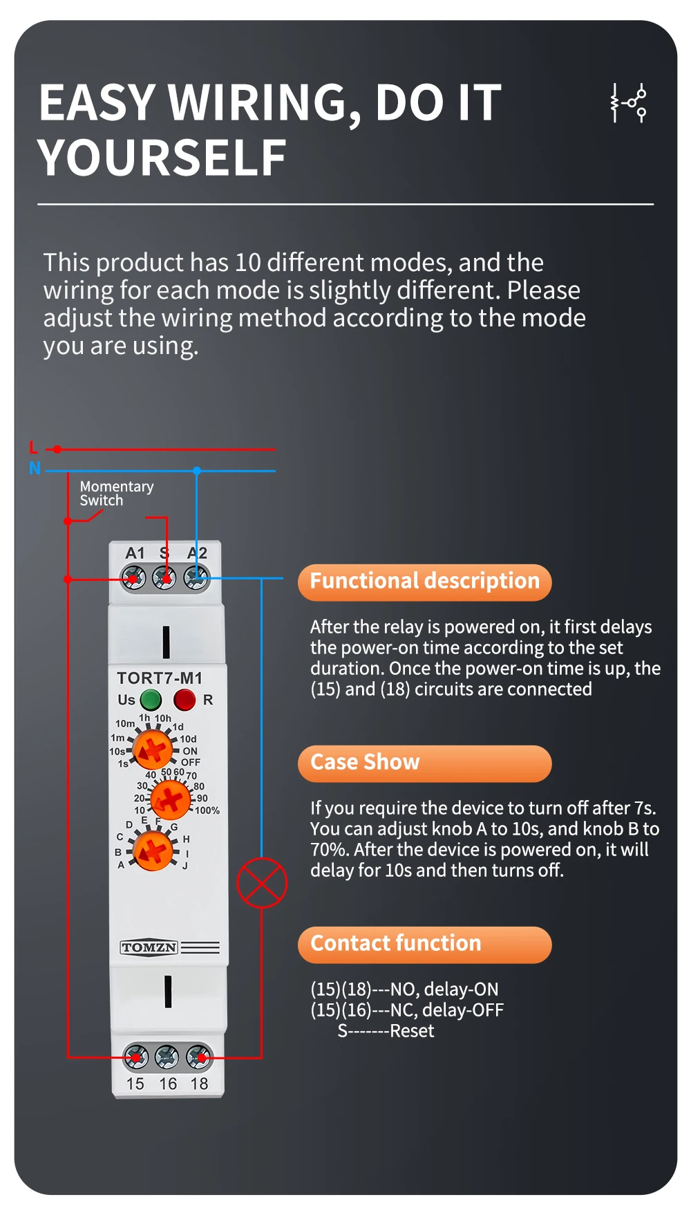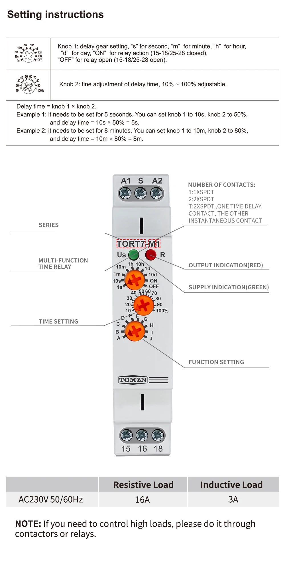 Input voltage U must be applied continuously. When trigger switch S is closed, time delay t begins. When time delay t is complete, relay contacts R change state and remain transferred until trigger switch S is opened.If input voltage U is removed, relay contacts R return to their shelf state