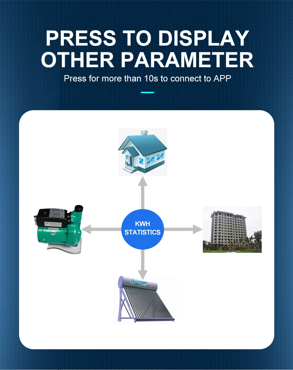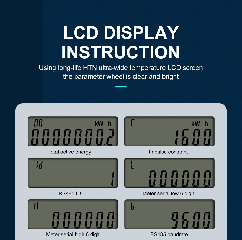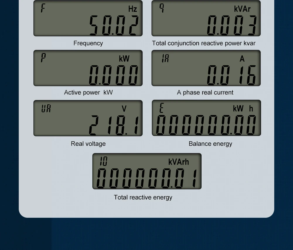 3. LCD display, Real-time display of Voltage, Current, Active Power, reactive Power, power factory ,frequence, total Energy kWh