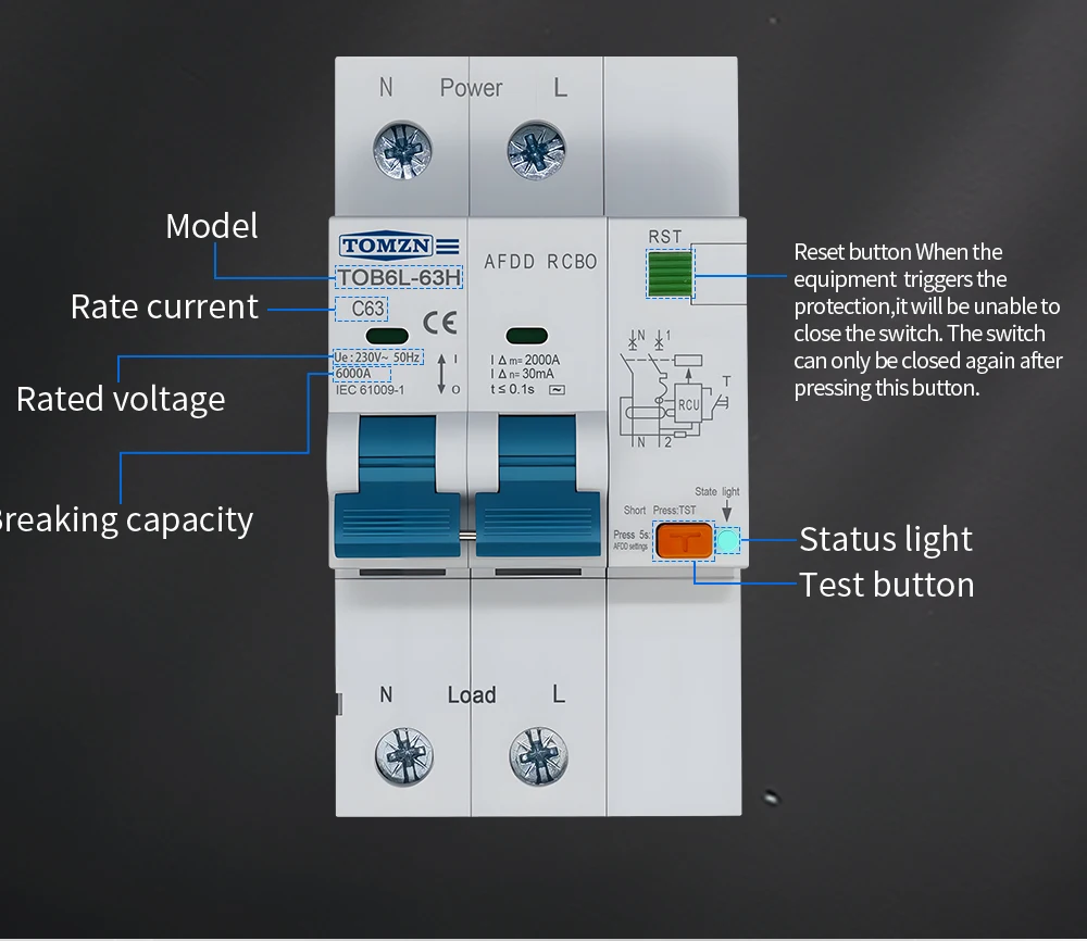 The TOMZN 2P AC230V 63A AFDD RCBO is a cutting-edge device that provides a comprehensive suite of electrical protection features. Designed to safeguard against short circuits, overloads, and residual current leakage, this circuit breaker is an essential component for any electrical installation. With its adjustable rated current ranging from 10A to 63A and a breaking capacity of 6kA, it caters to a wide range of applications, ensuring that your electrical circuits remain safe and reliable.