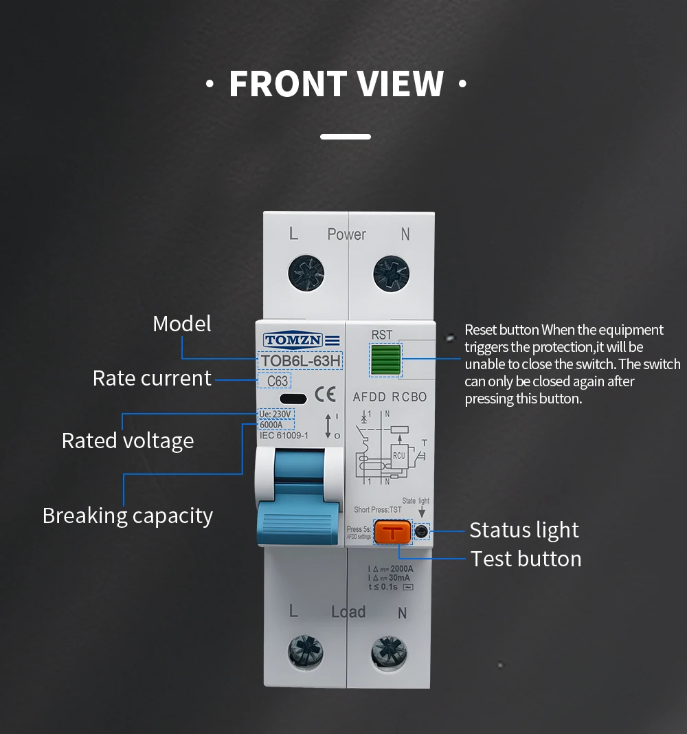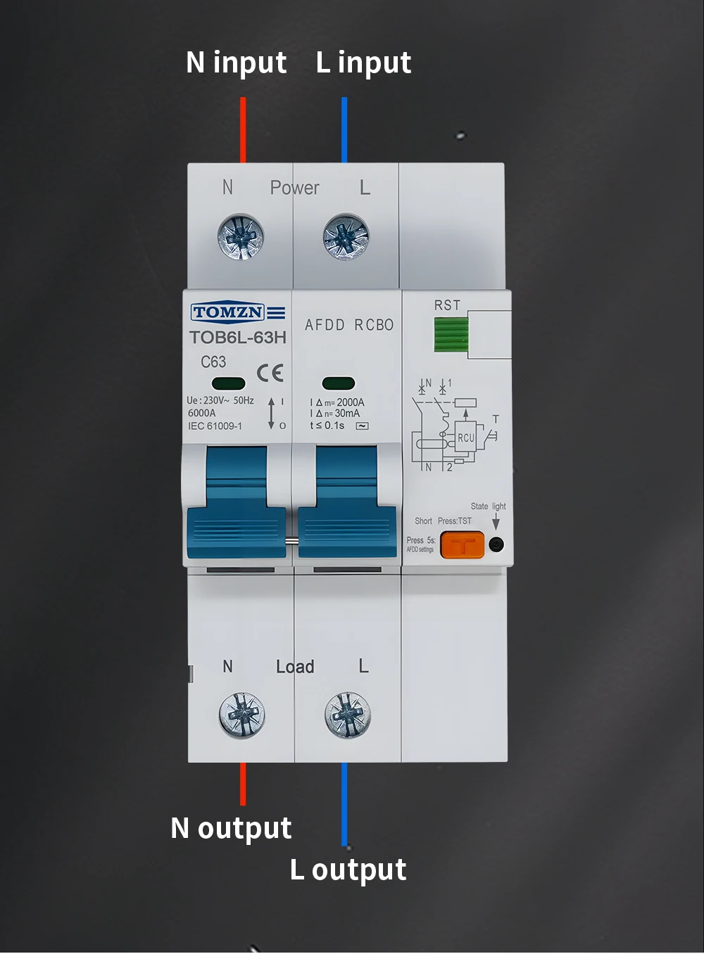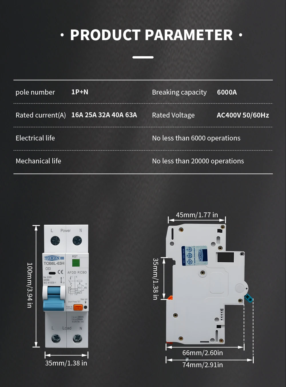 The TOMZN AFDD RCBO meets the highest safety standards, complying with both IEC 61009 for RCBO and IEC 62606 for AFDD. This means that it is not only a high-quality product but also one that adheres to the latest safety regulations. The arc fault protection feature is crucial in preventing the dangerous arcing that can occur in electrical circuits, offering an additional layer of safety beyond traditional circuit breakers. Its compact design, with a 35mm DIN rail mounting, ensures that it can be easily integrated into any existing electrical system.