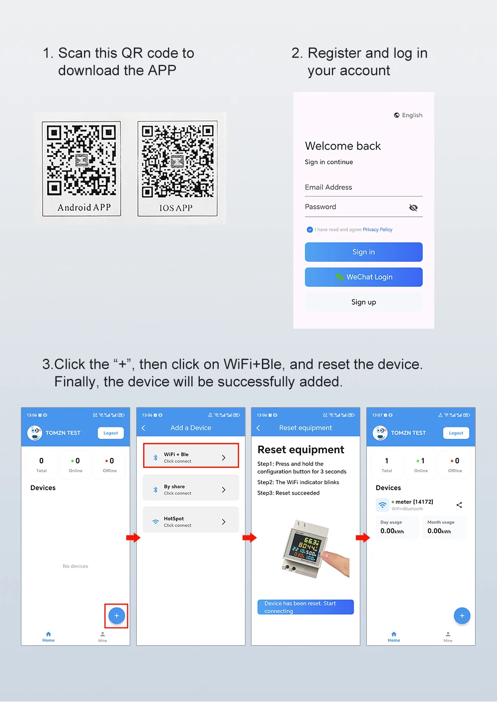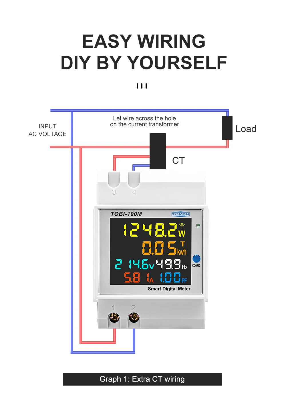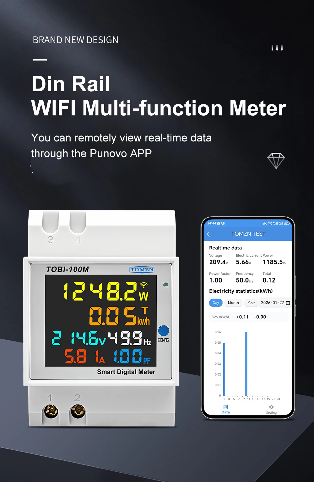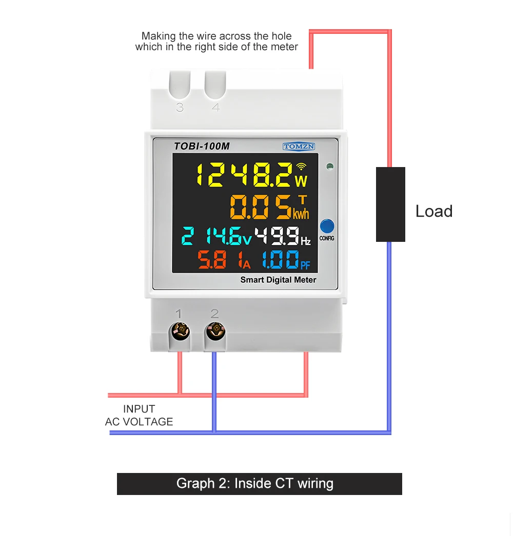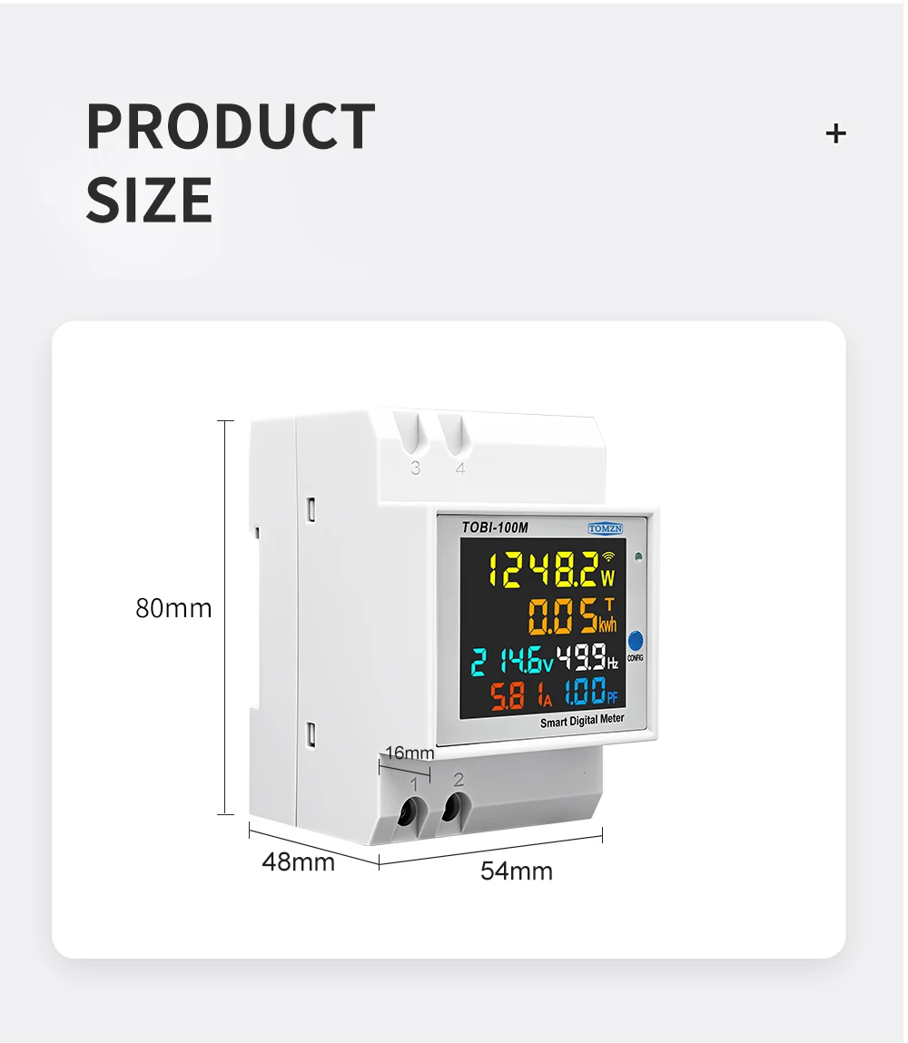 Smart meter TOBI-100M can to be measure and display AC voltage, AC current, active power, power factor, frequence and electric energy at same time, After the meter to be connect to 2.4G WIFI and bind with your wechat or app, you can see all of the electric parameters in your cell-phone any where,at the same time the app will show the statistics of the days, month and year of the electric energy.