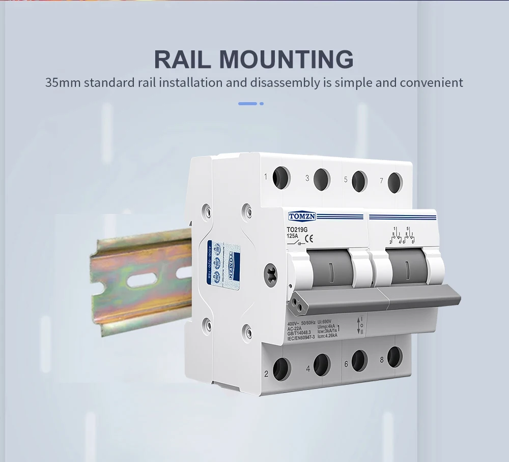 TO219G is a versatile manual isolation switch integrating four core functions: On, Off, Transfer, and Isolation. It enables safe switching or isolation between two loads on a single line or between two independent power sources. Constructed with a high-flame-retardant PA66 housing for durability, it is designed for easy DIN rail (35×7.5) mounting. Rated for 125A, it provides a reliable and safe solution for power switching and isolation in industrial equipment and circuits.