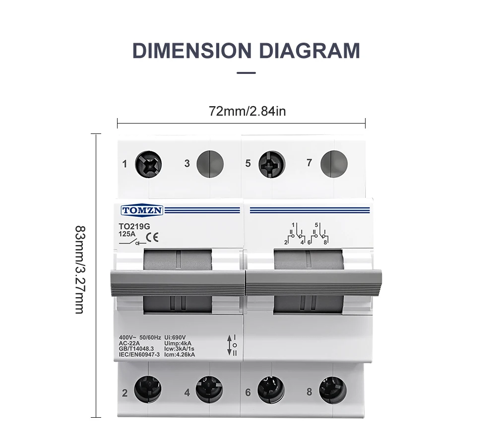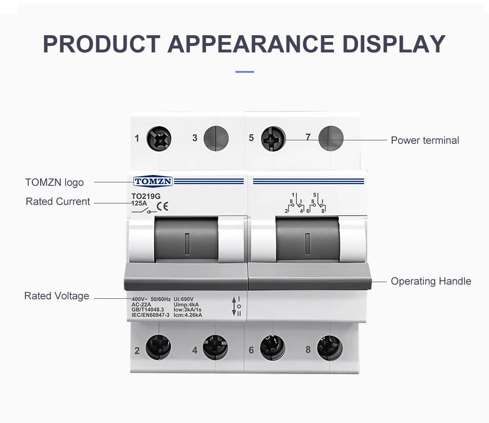 In summary, the TOMZN TO219G is a high-quality, durable, and reliable manual transfer switch that provides a safe and efficient way to switch between two power sources. With its 2P configuration, 230VAC voltage rating, and 125A current capacity, it is suitable for a wide range of applications. Its isolating interlock mechanism and disconnectable design ensure maximum safety and ease of maintenance, making it an ideal choice for both residential and commercial use. Whether you’re looking to enhance the reliability of your electrical system or ensure a smooth power transition, the TO219G is a dependable and efficient solution.