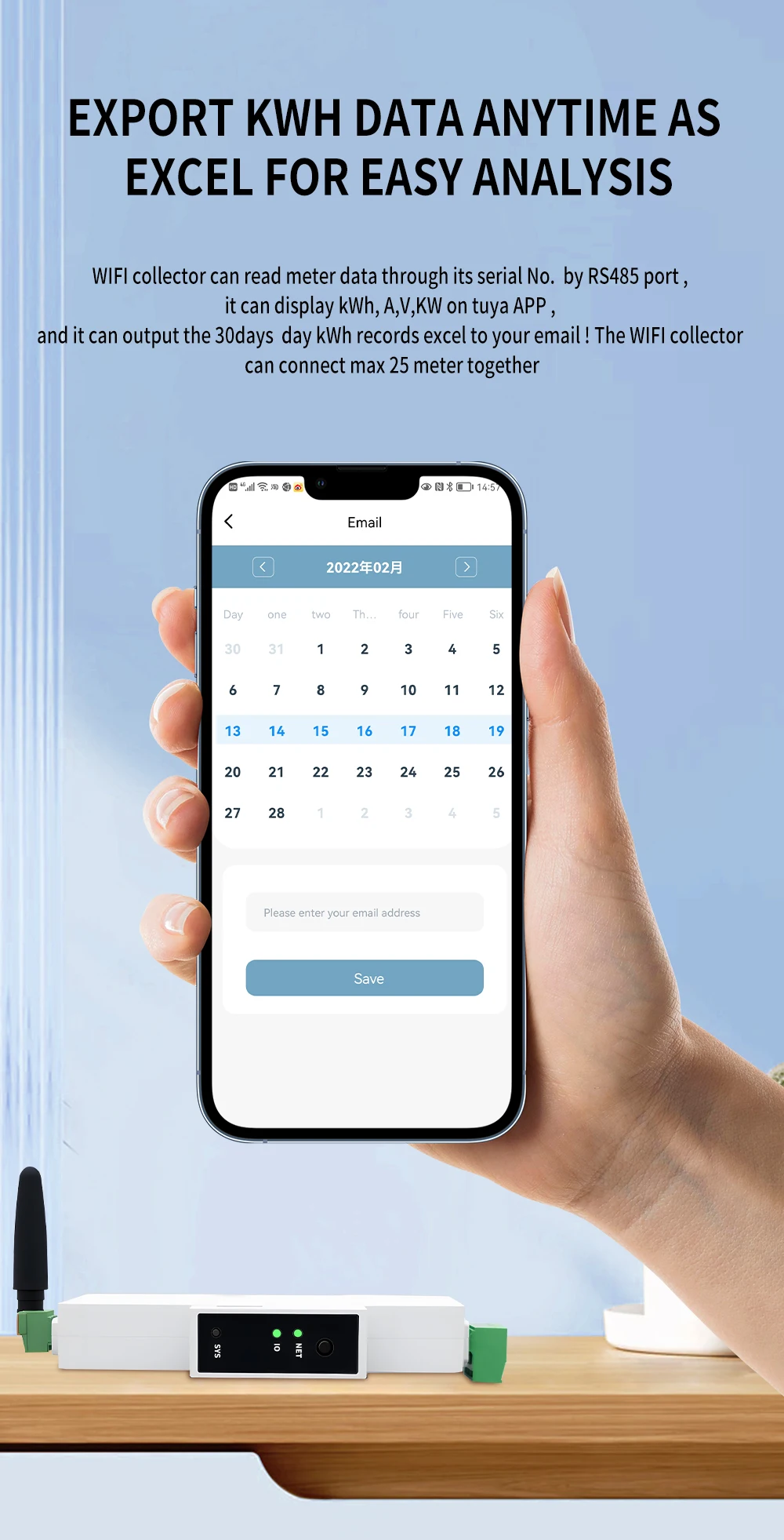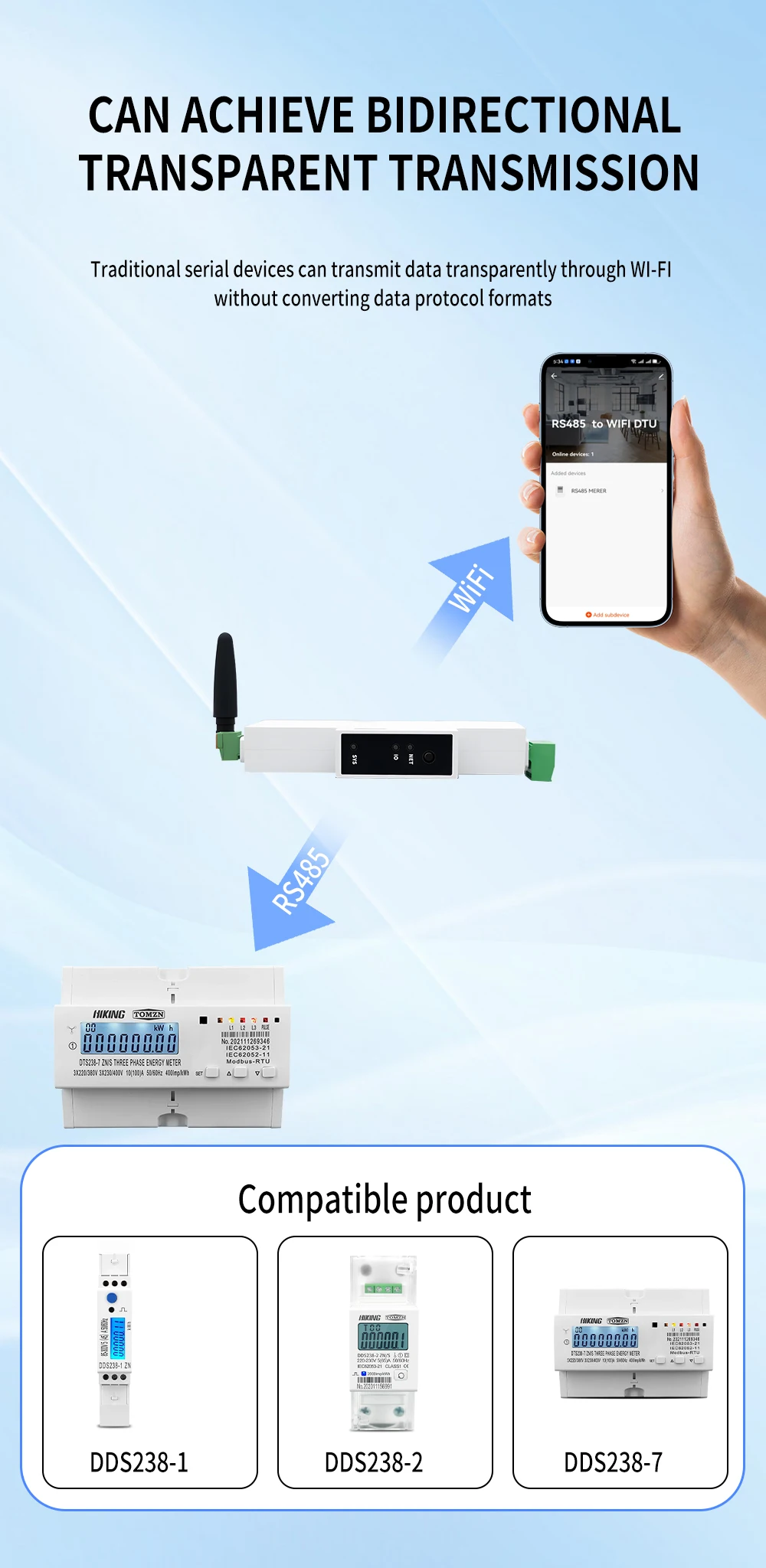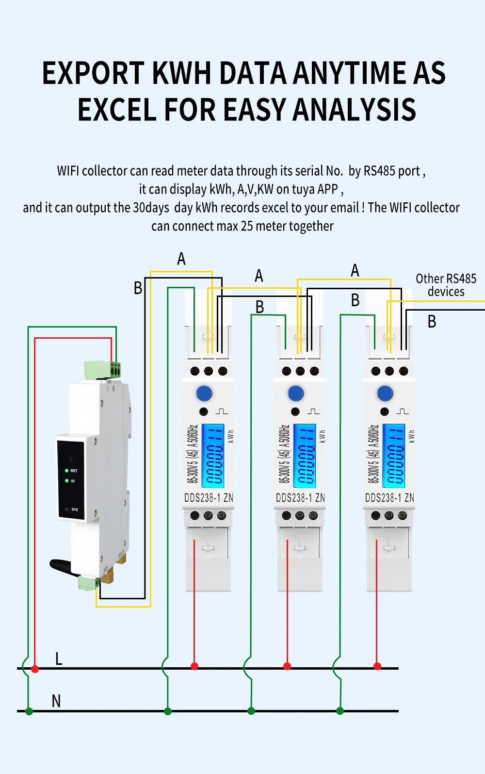 TCB11-W can connect up to 25PCS RS485 energy meter. And it can also read data from and control the devices via WIFI.