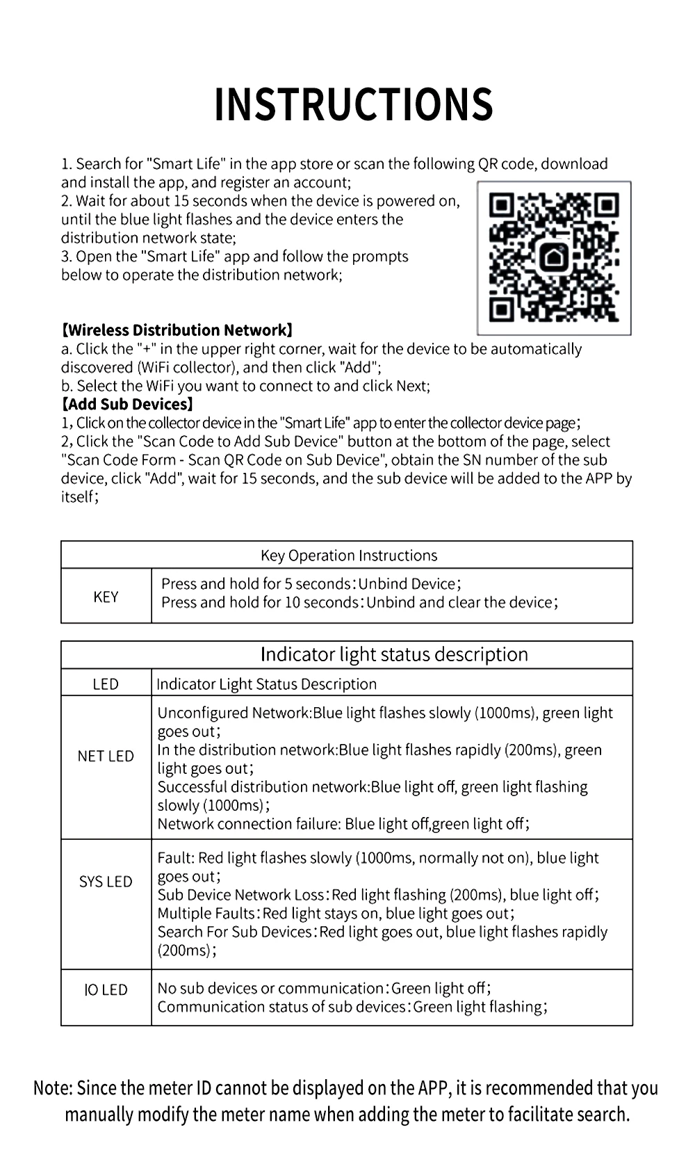 - Press and hold for 10 seconds:Unbind and clear the device
