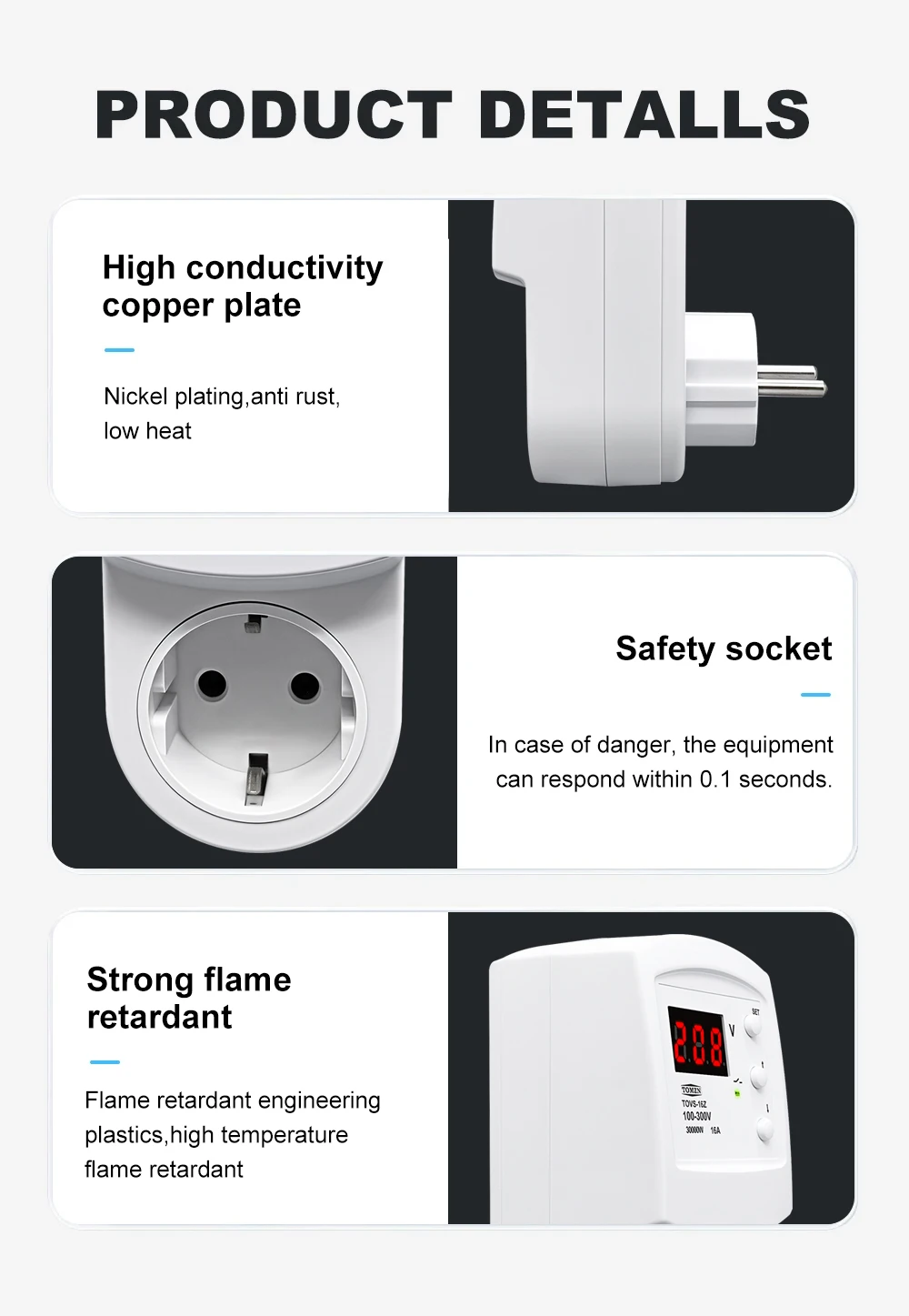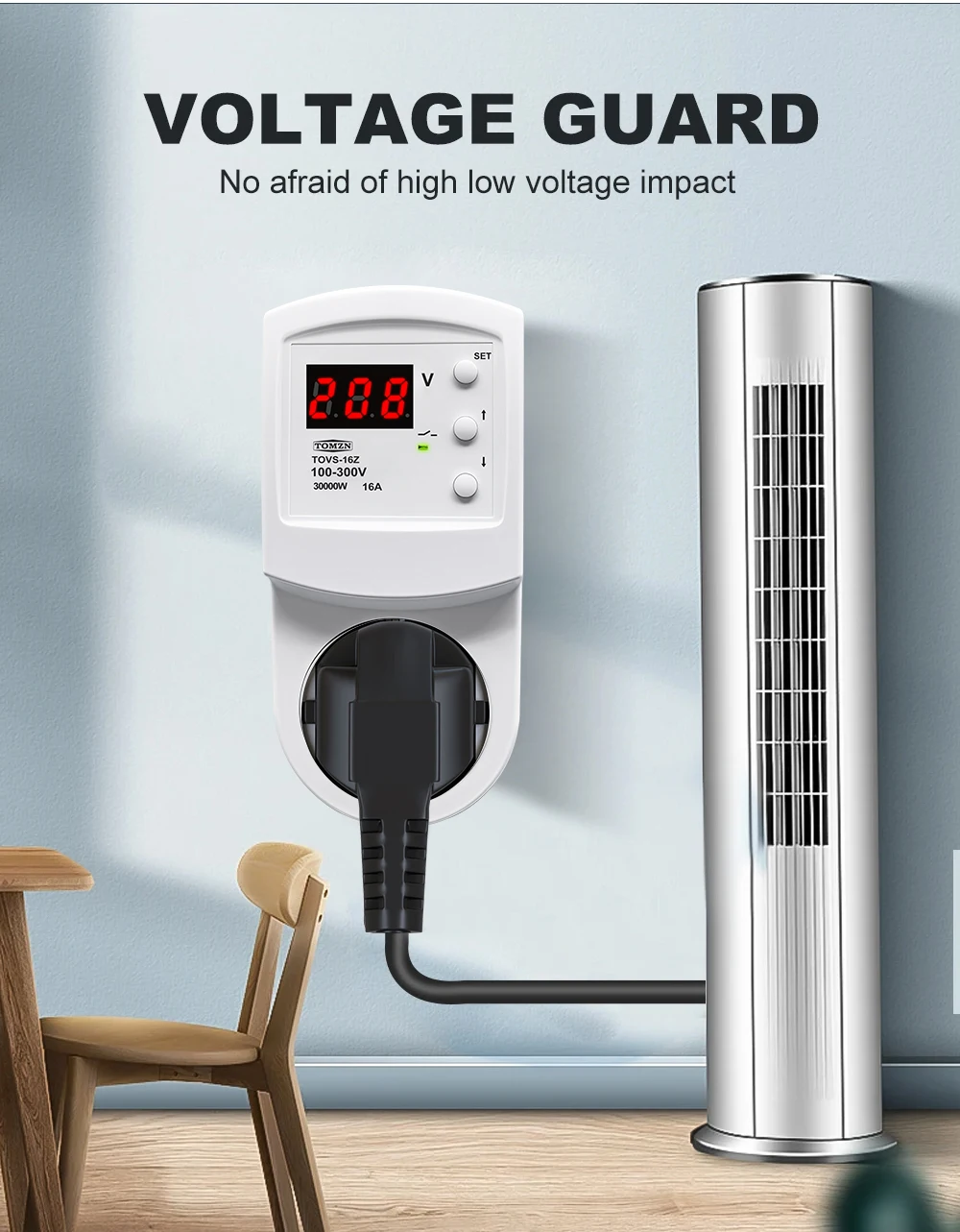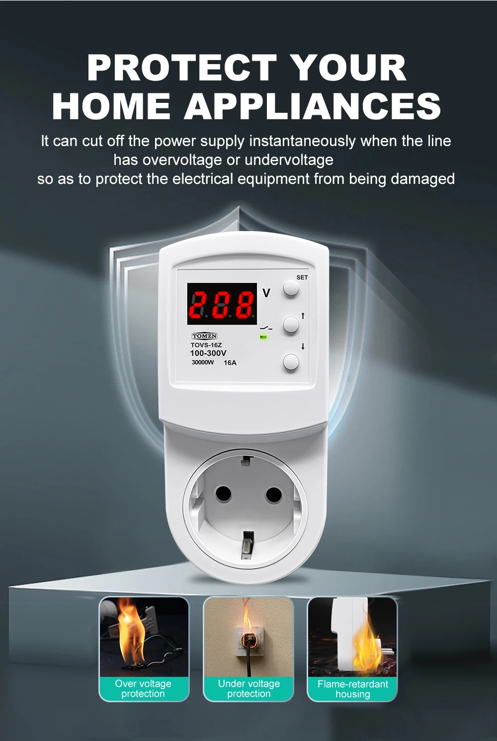 The TOMZN TOVS-16Z Automatic Voltage Protector Socket is a reliable solution for safeguarding your electrical appliances against overvoltage and undervoltage conditions. This smart device, although not a smart device, is designed to provide instantaneous protection when voltage levels deviate from the preset thresholds. With a power supply range of 100-300VAC, it is suitable for a variety of electrical systems, catering to both residential and commercial environments.