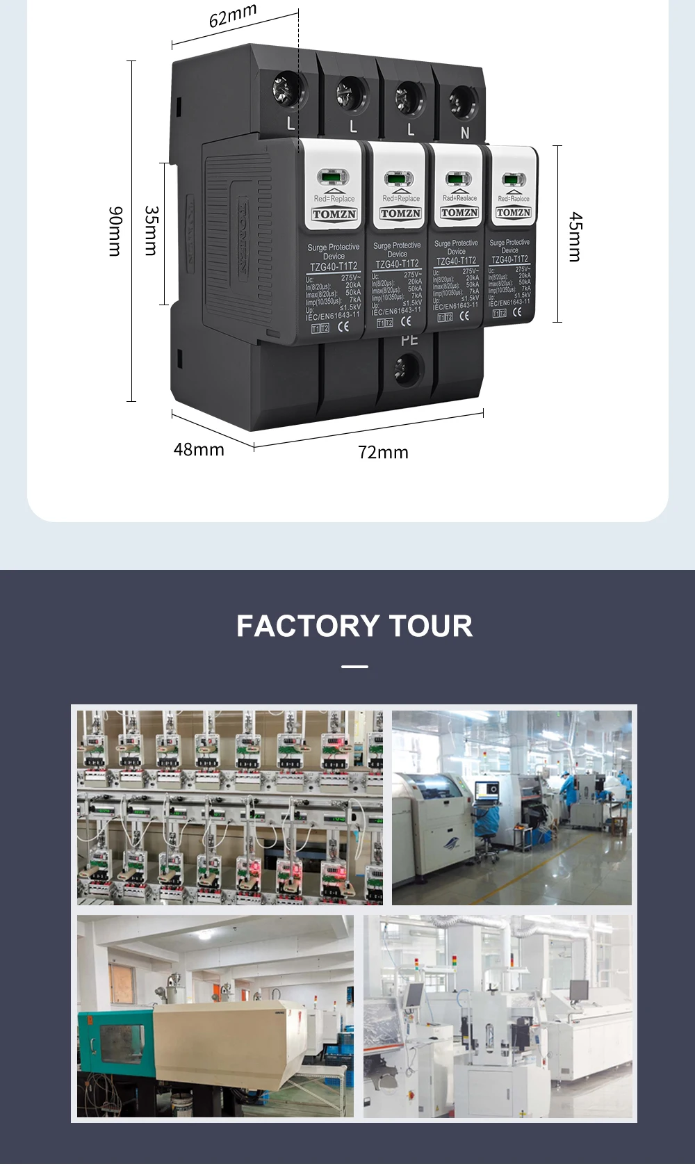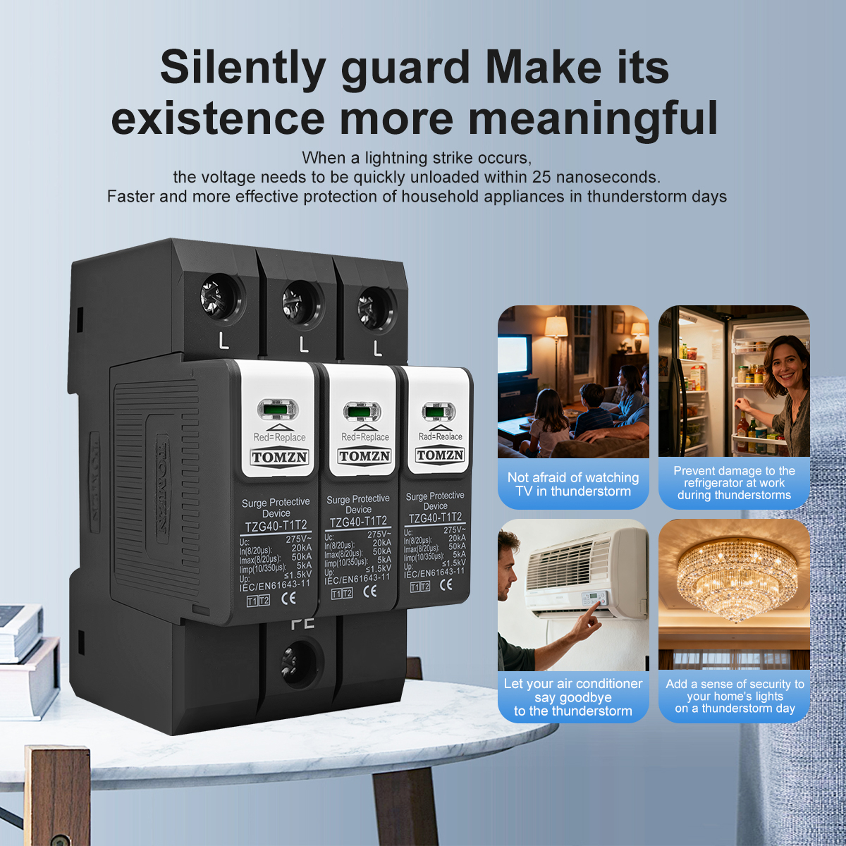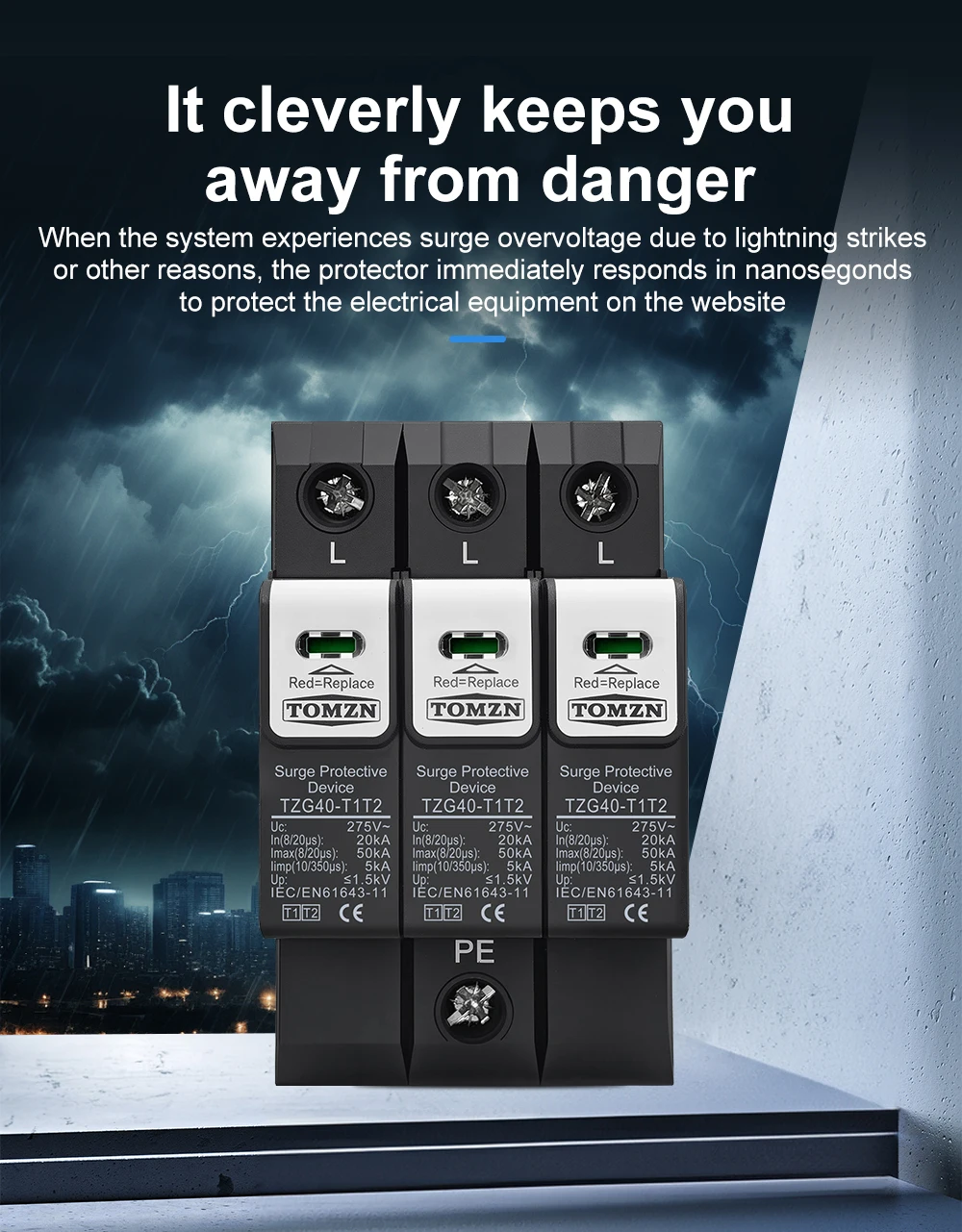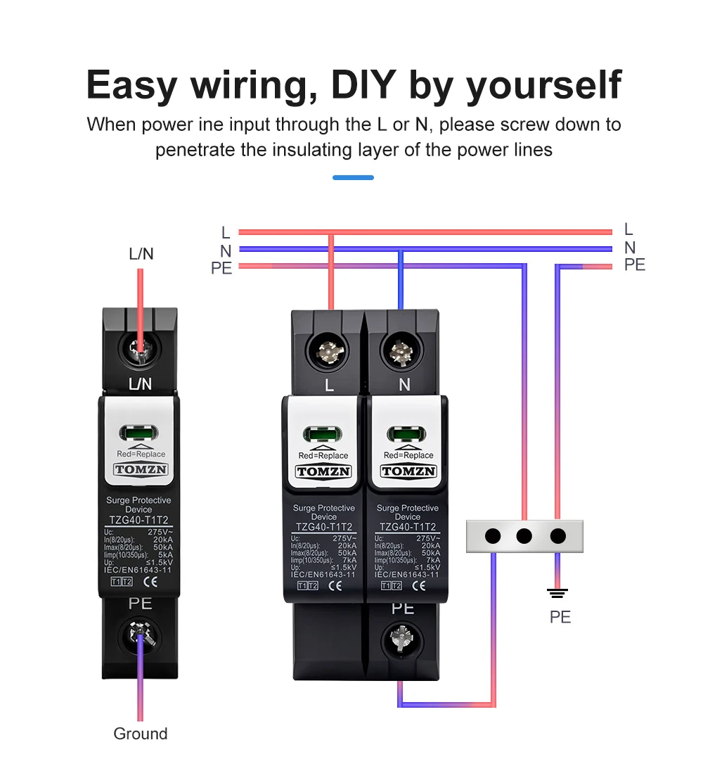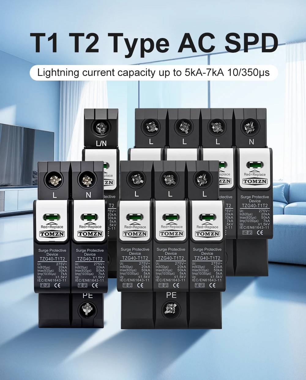 The TOMZN TZG40-T1T2 meets or exceeds international standards for surge protection, including IEC 61643-1 and IEC 61643-22. These standards ensure that the device is tested and certified for performance, safety, and durability. This compliance gives users confidence in the product’s quality and effectiveness.