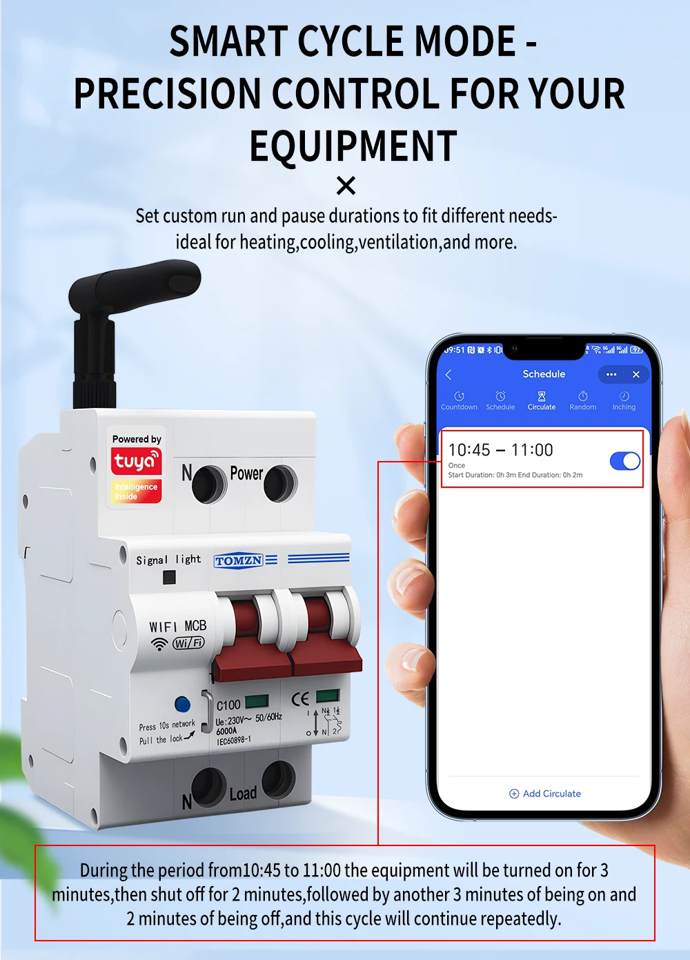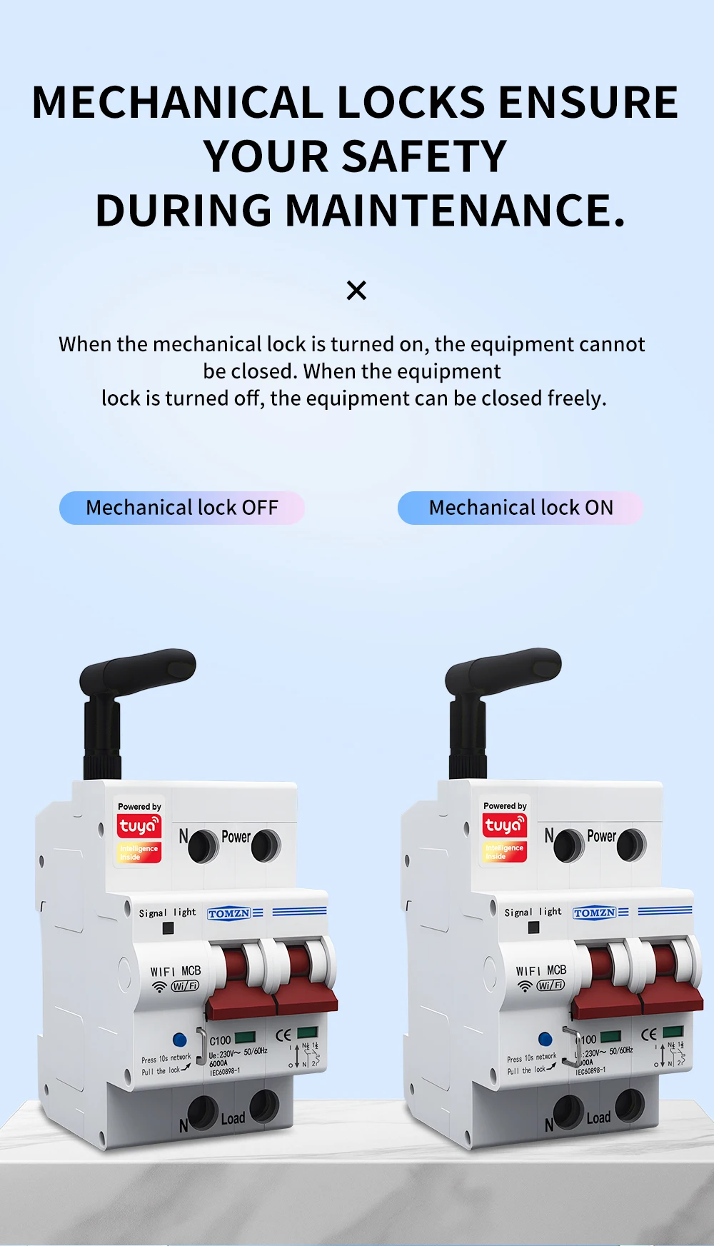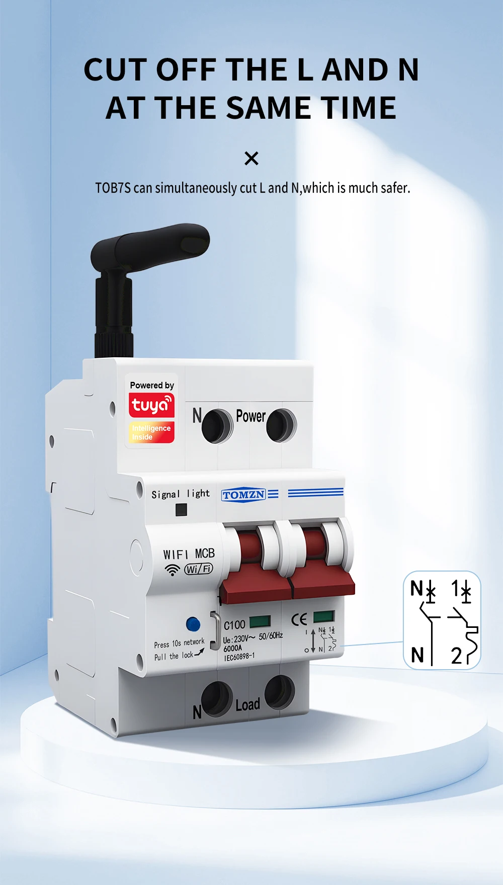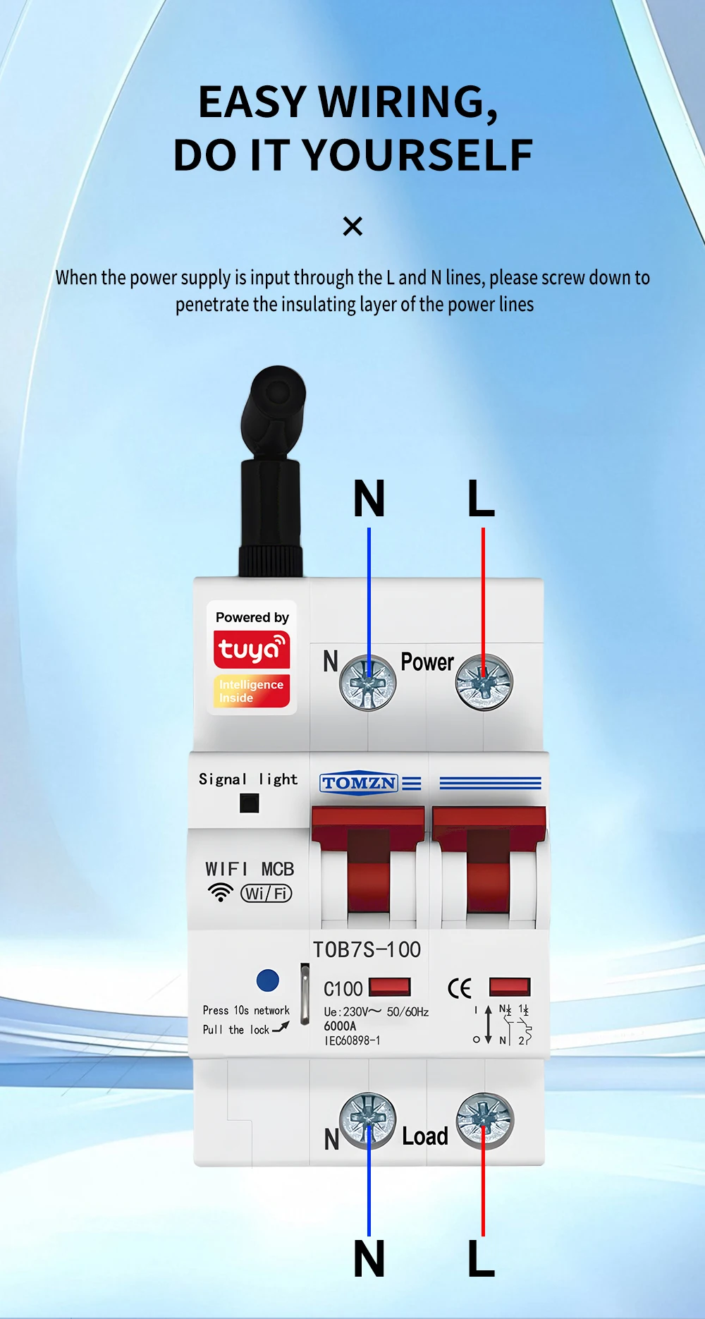 The TOMZN WIFI Smart Circuit Breaker is an indispensable component for modern homes and businesses, designed to offer an unparalleled blend of safety and convenience. With a rated voltage of 230VAC and a versatile current range from 10A to 100A, this smart circuit breaker is a reliable choice for various electrical loads, from small household appliances to larger industrial equipment. The advanced overload and short-circuit protection ensures that the circuit remains safe, even in the event of a fault, while the short-circuit and overload trip mechanisms minimize the risk of fire hazards.