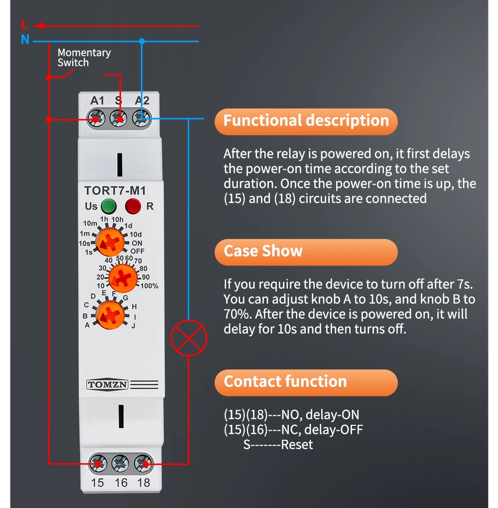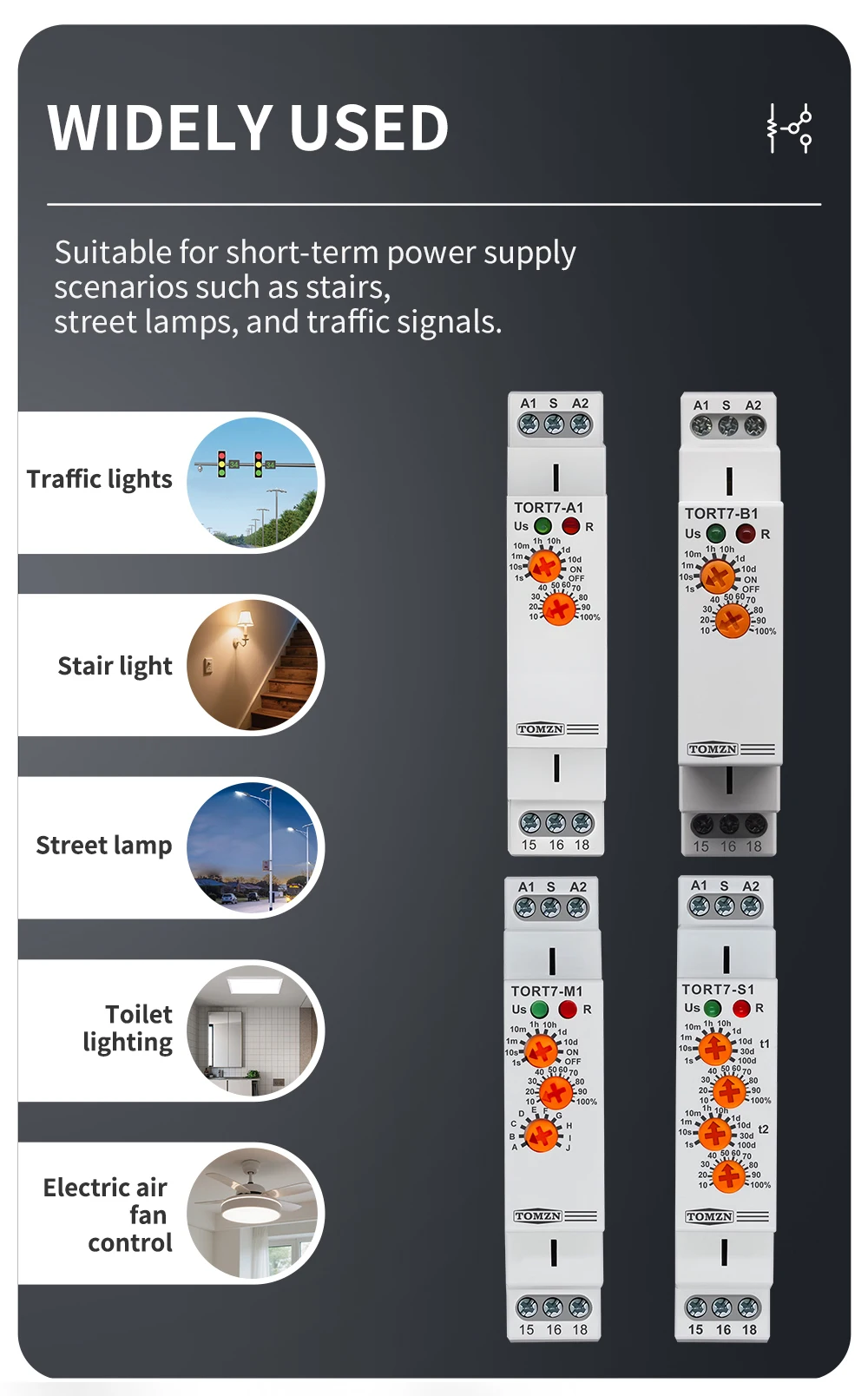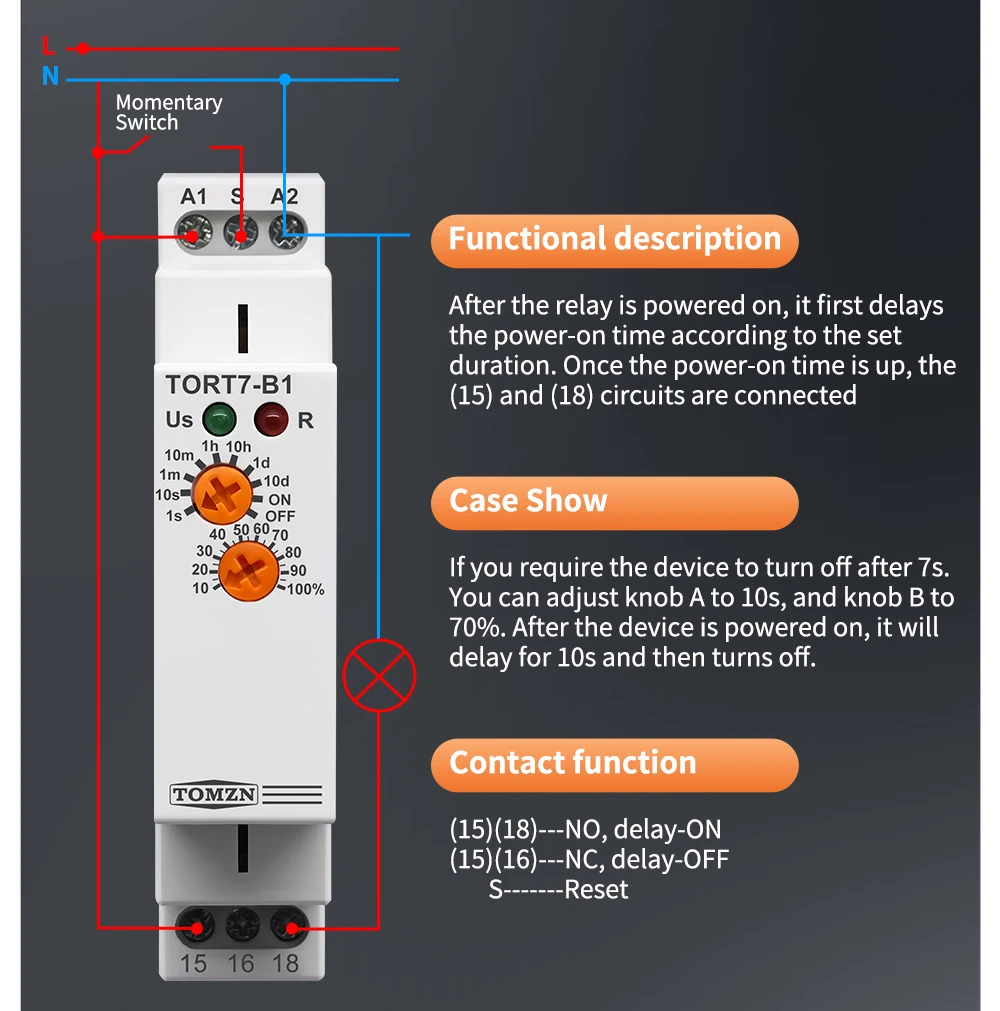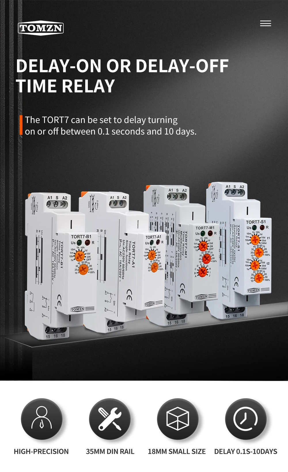 TOMZN TORT7 series is a versatile, high-performance off-delay time relay designed for robust industrial automation and control applications. It excels in scenarios requiring a delayed ON/OFF after a control signal is removed, such as providing pump decay time after a heating system is switched off or for the extended operation of ventilation fans. With a flexible timing capacity that scales from 0.1 seconds up to 10 days across ten selectable ranges, it offers unparalleled adjustment versatility. The relay is available in two output configurations to suit various load control needs and features a clear LED status indicator for easy monitoring. Housed in a standard 18mm DIN rail module.