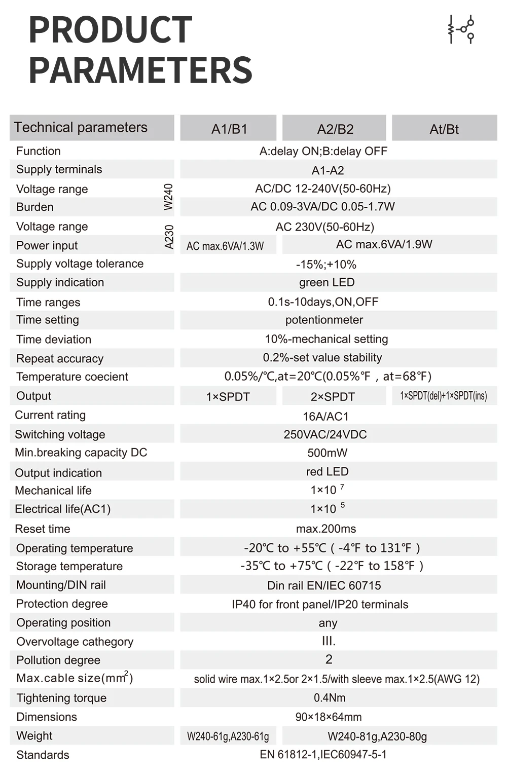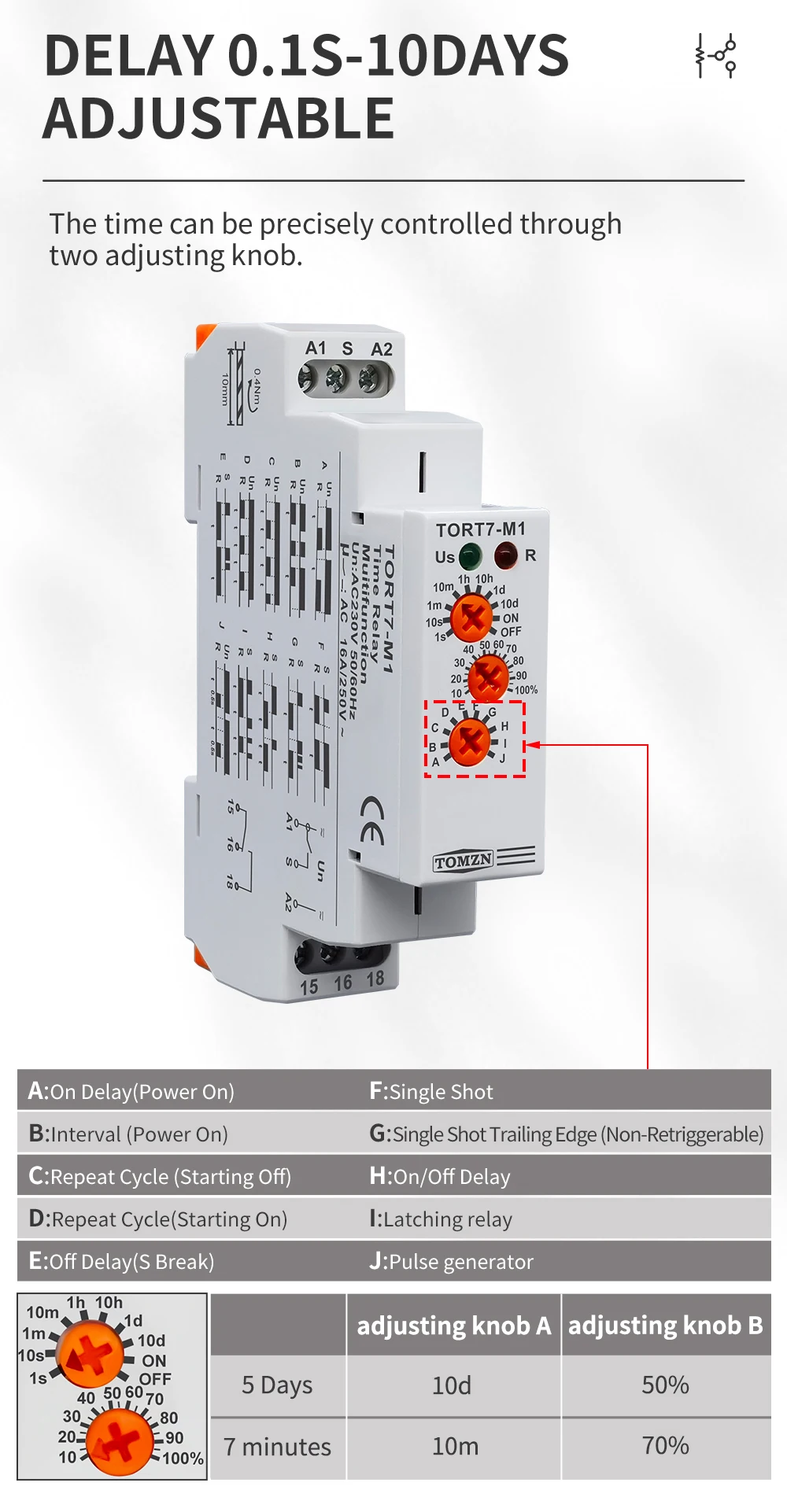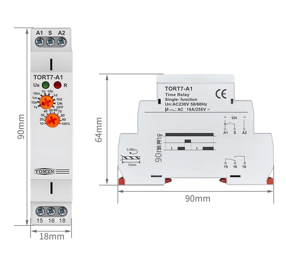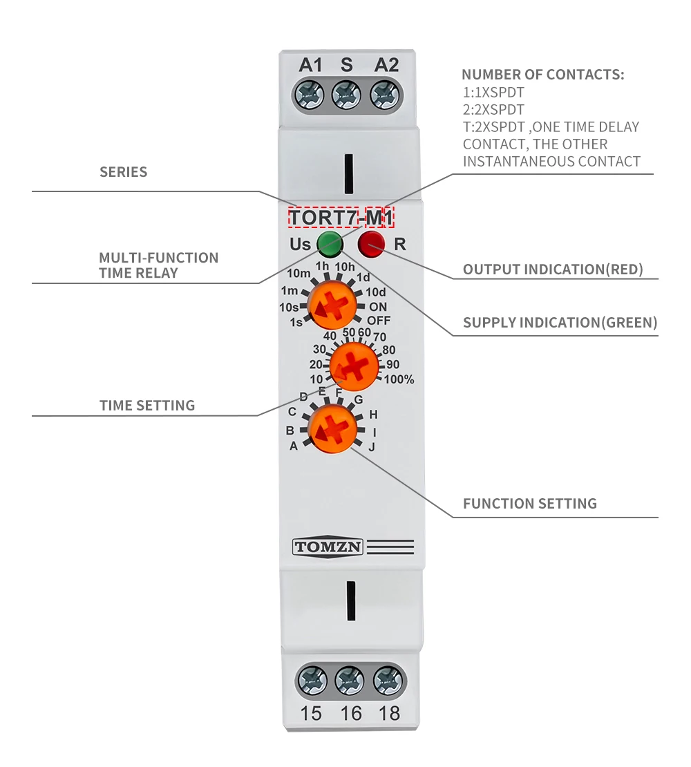 TOMZN TORT7 series is a versatile, high-performance off-delay time relay designed for robust industrial automation and control applications. It excels in scenarios requiring a delayed ON/OFF after a control signal is removed, such as providing pump decay time after a heating system is switched off or for the extended operation of ventilation fans. With a flexible timing capacity that scales from 0.1 seconds up to 10 days across ten selectable ranges, it offers unparalleled adjustment versatility. The relay is available in two output configurations to suit various load control needs and features a clear LED status indicator for easy monitoring. Housed in a standard 18mm DIN rail module.