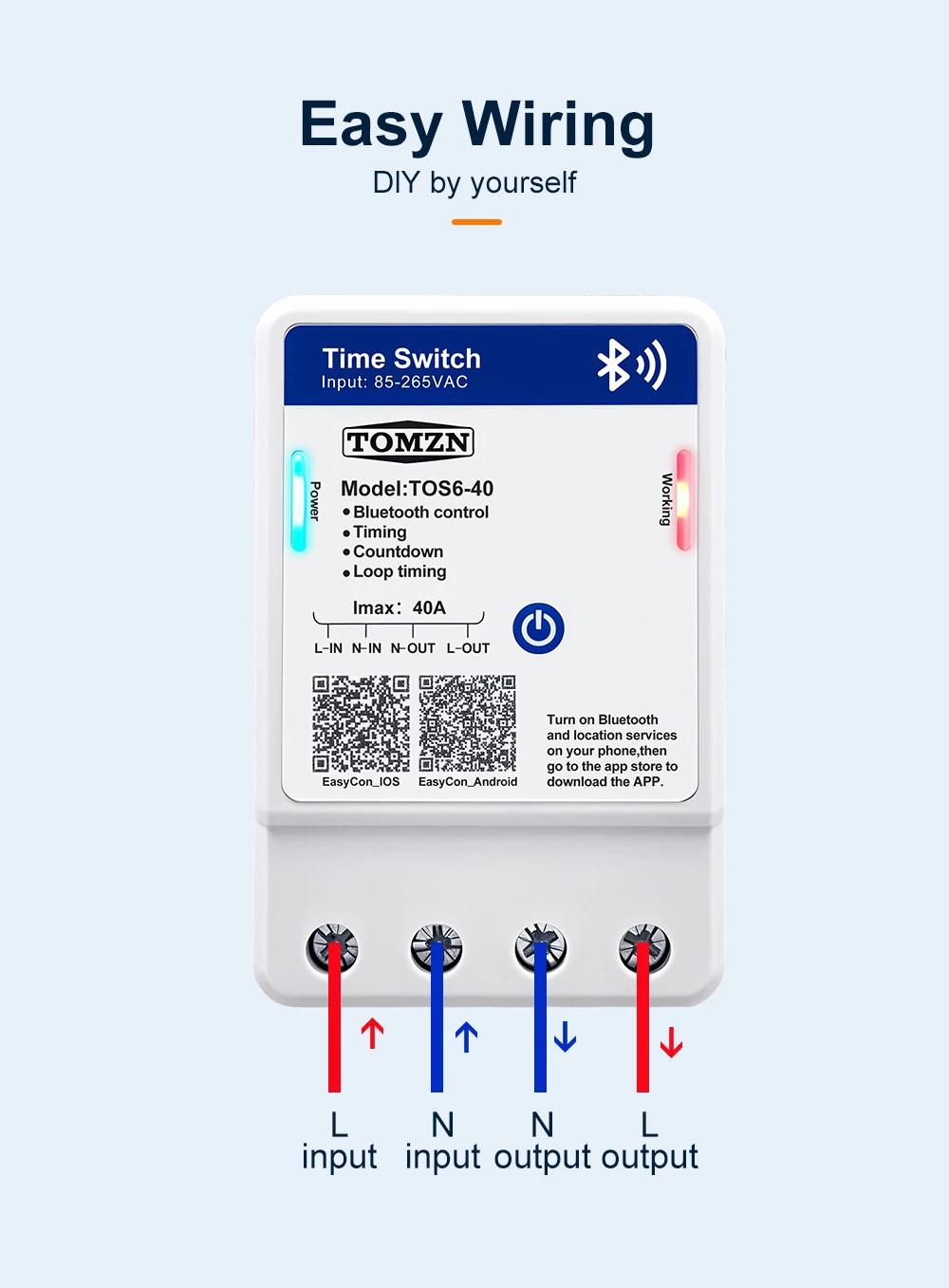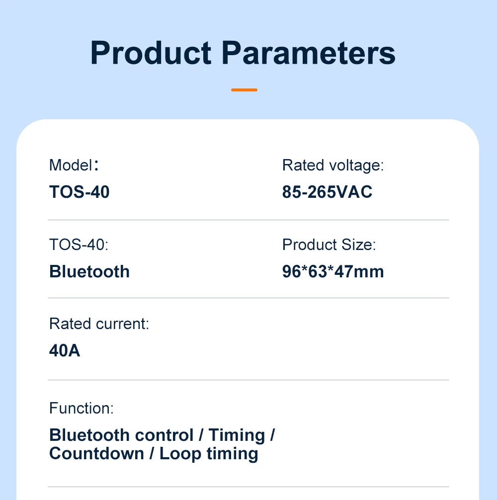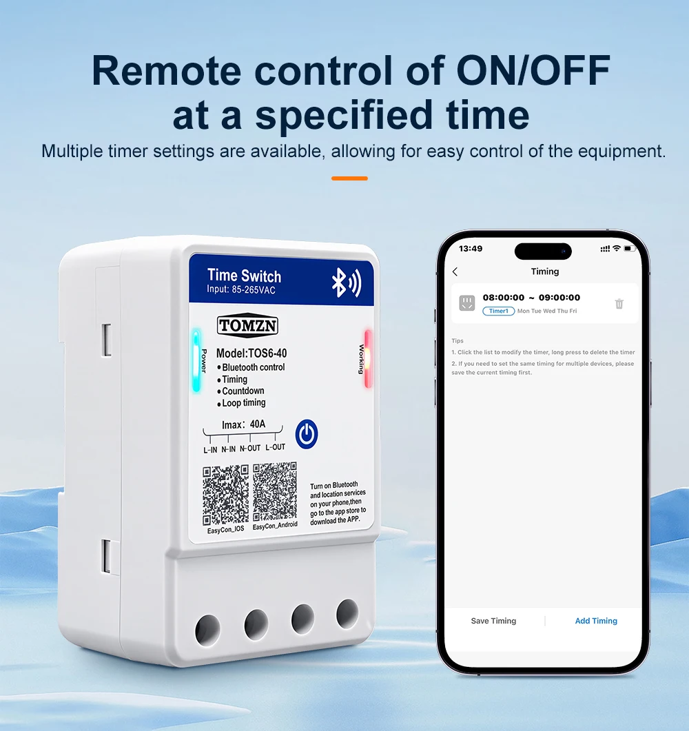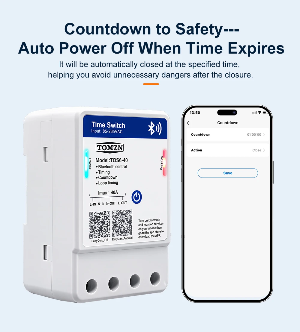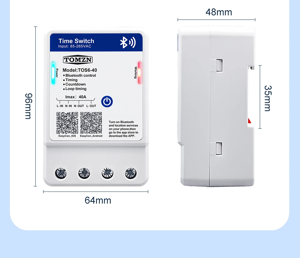 TOS6-40 is a Bluetooth smart time control switch. It enables remote control of the device’s on/off, countdown, timing, and loop timing functions through the EasyCon APP. The timing function can support a maximum of 28 sets of settings. The rated voltage of this device is 85 – 265VAC, making it compatible with both 110V and 220V voltage standards in different countries. This device allows you to remotely control your circuit with ease.