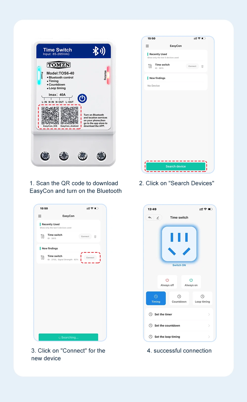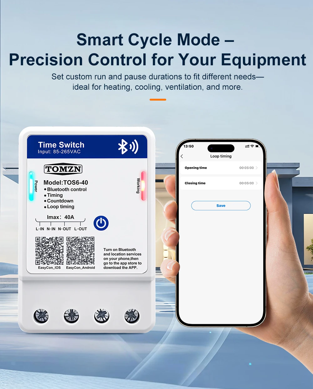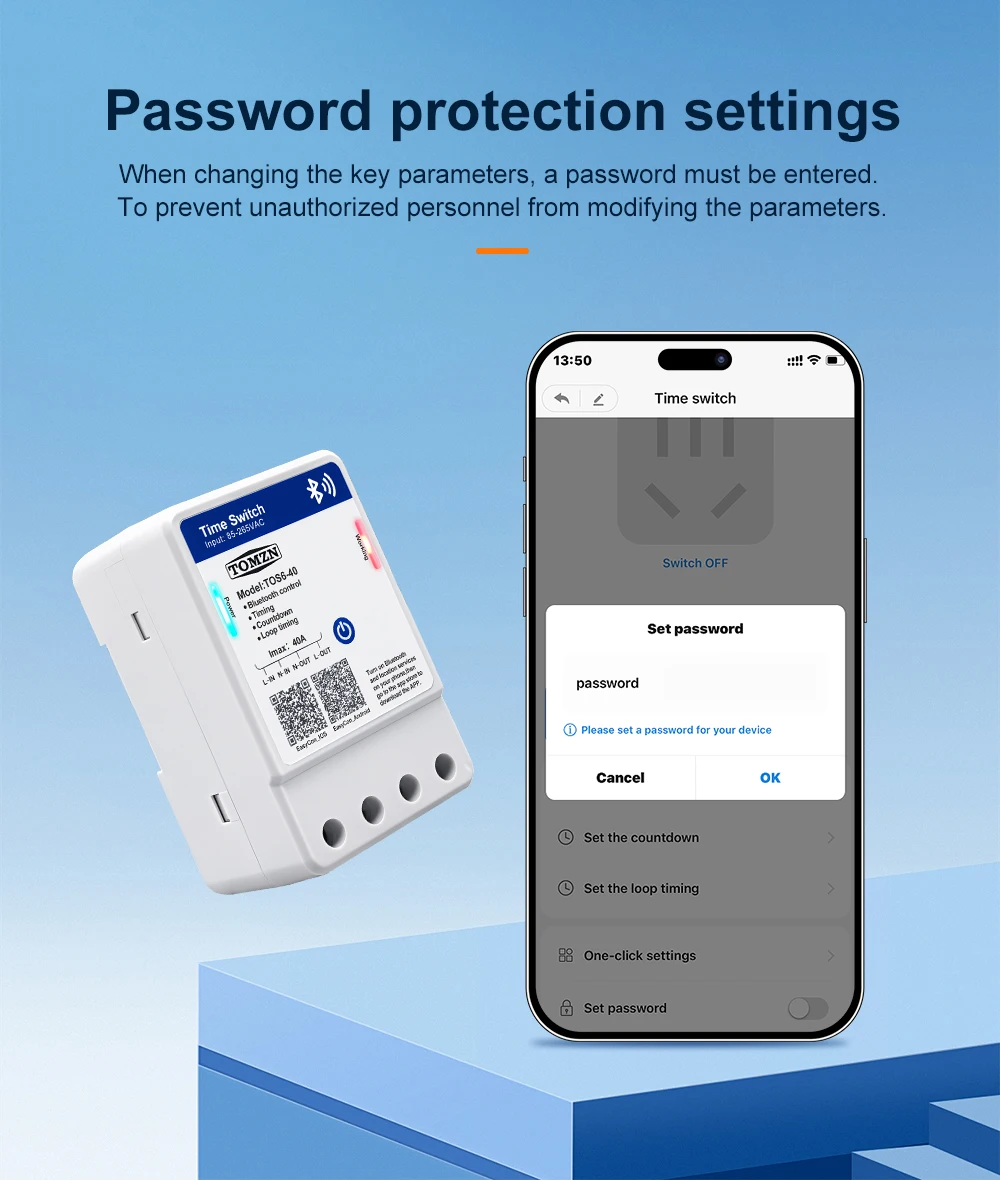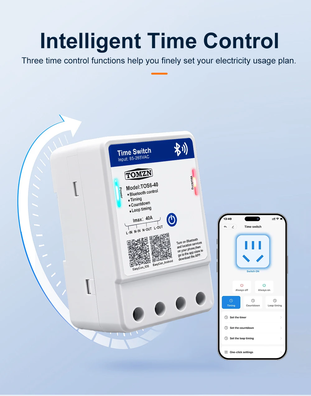 TOS6-40 is a Bluetooth smart time control switch. It enables remote control of the device’s on/off, countdown, timing, and loop timing functions through the EasyCon APP. The timing function can support a maximum of 28 sets of settings. The rated voltage of this device is 85 – 265VAC, making it compatible with both 110V and 220V voltage standards in different countries. This device allows you to remotely control your circuit with ease.